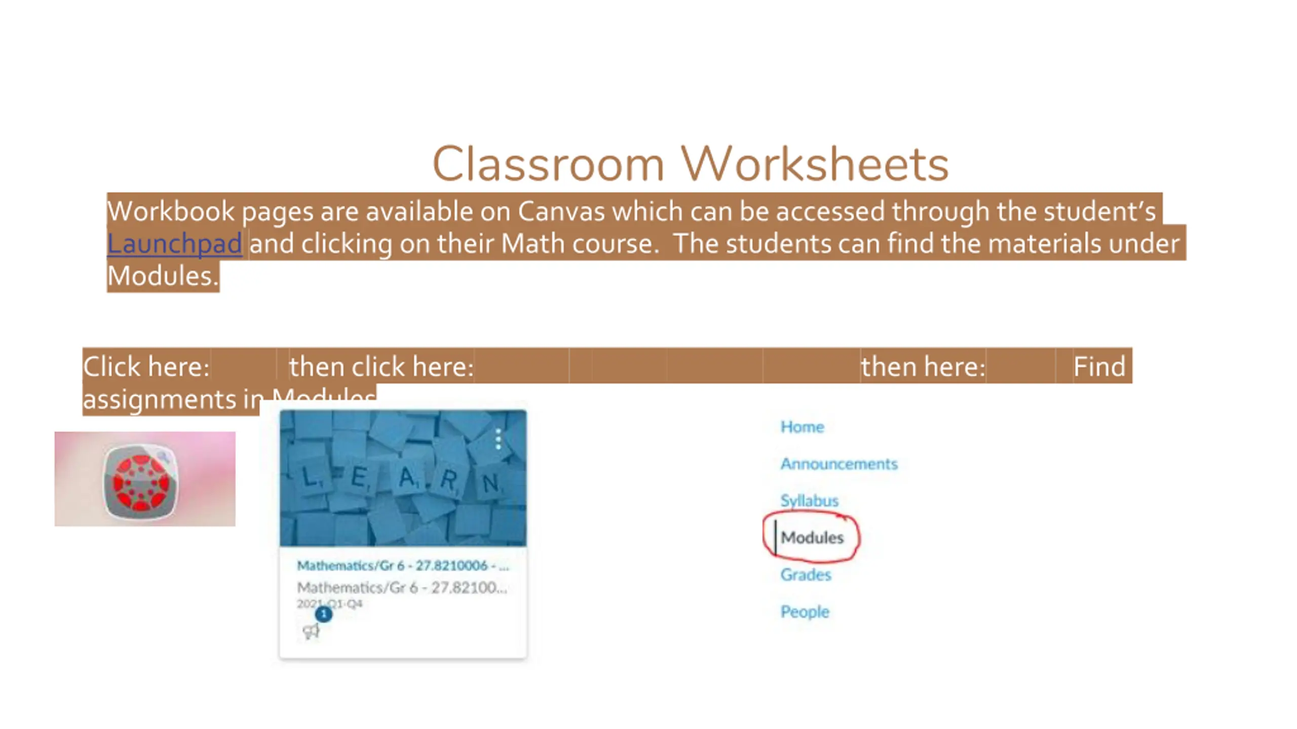 Classroom Worksheets Workbook pages are available on Canvas which can be accessed through the student s Launchpad and clicking on their Math course. The students can find the materials under Modules. Click here: assignments in Modules then click here: then here: Find