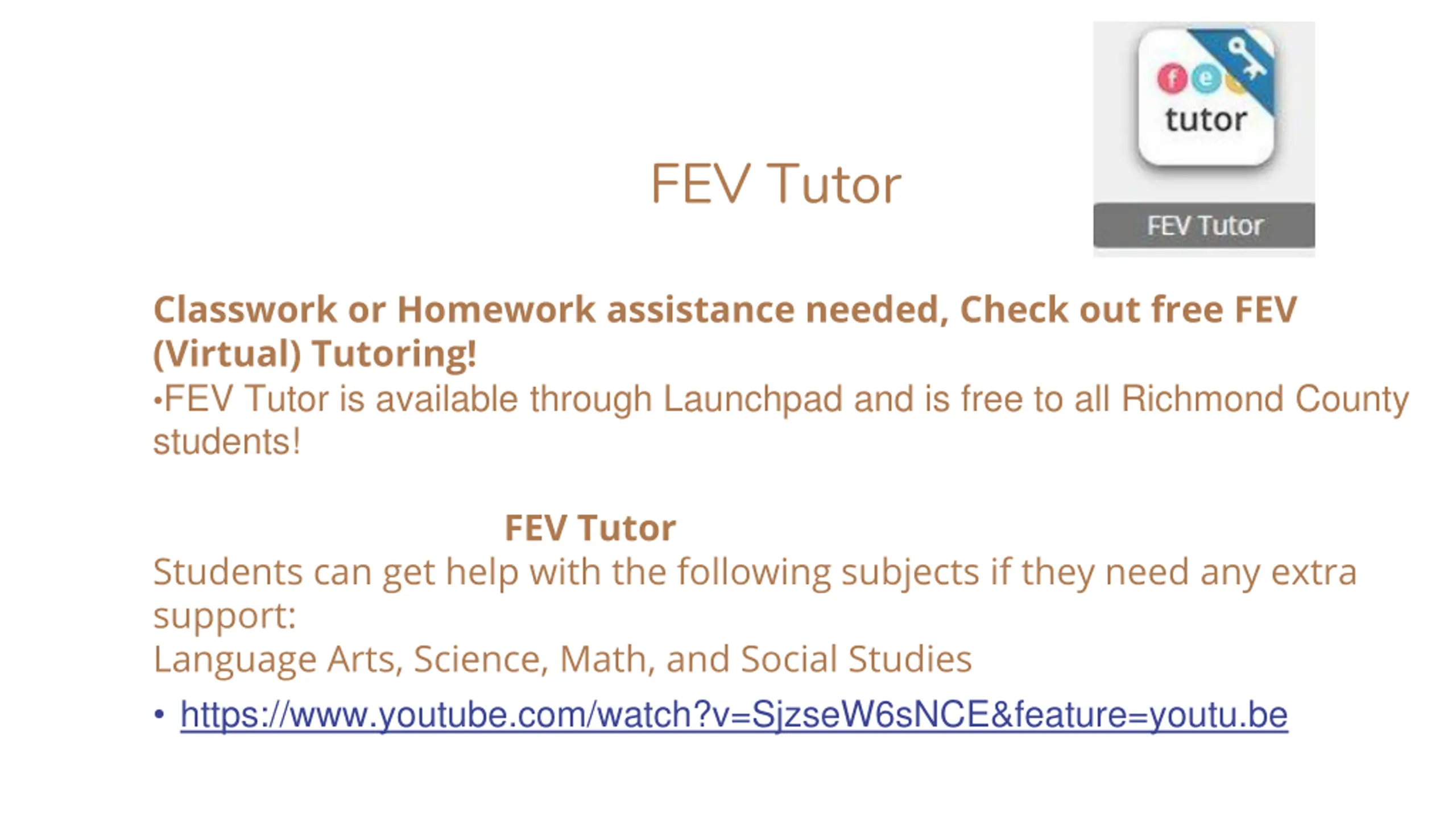 FEV Tutor Classwork or Homework assistance needed, Check out free FEV (Virtual) Tutoring! FEV Tutor is available through Launchpad and is free to all Richmond County students! FEV Tutor Students can get help with the following subjects if they need any extra support: Language Arts, Science, Math, and Social Studies https://www.youtube.com/watch?v=SjzseW6sNCE&feature=youtu.be
