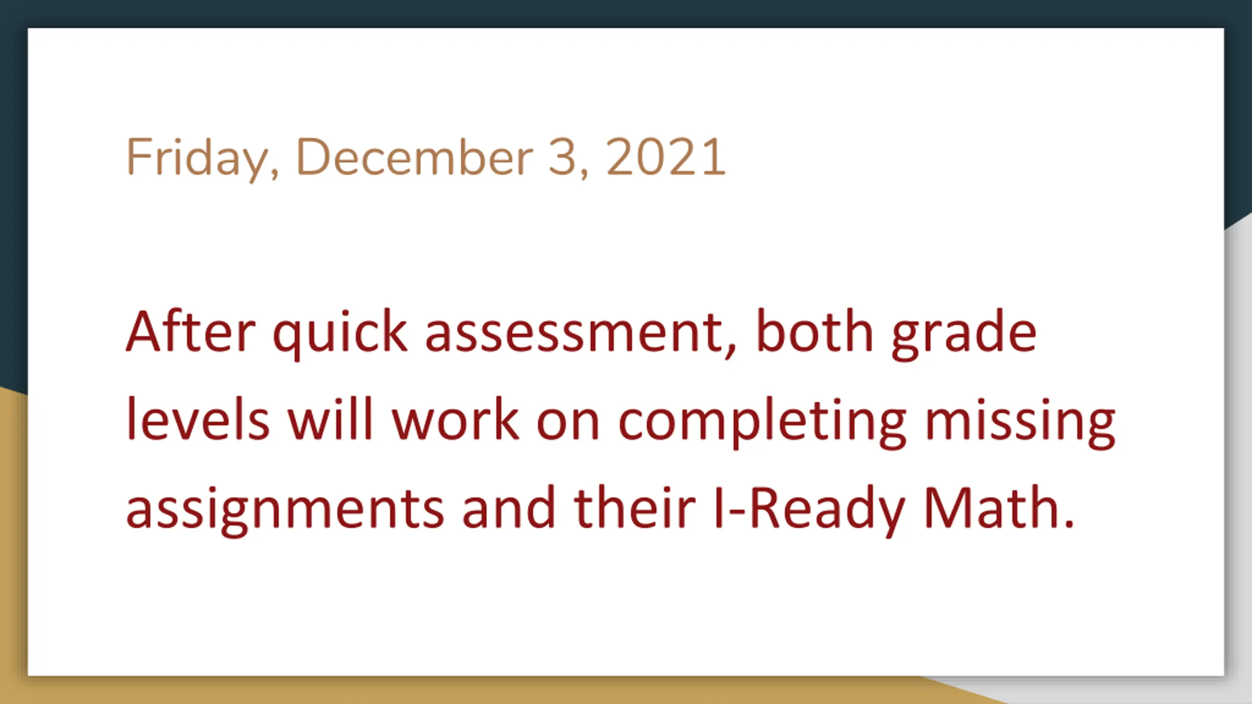 Friday, December 3, 2021 After quick assessment, both grade levels will work on completing missing assignments and their I-Ready Math.