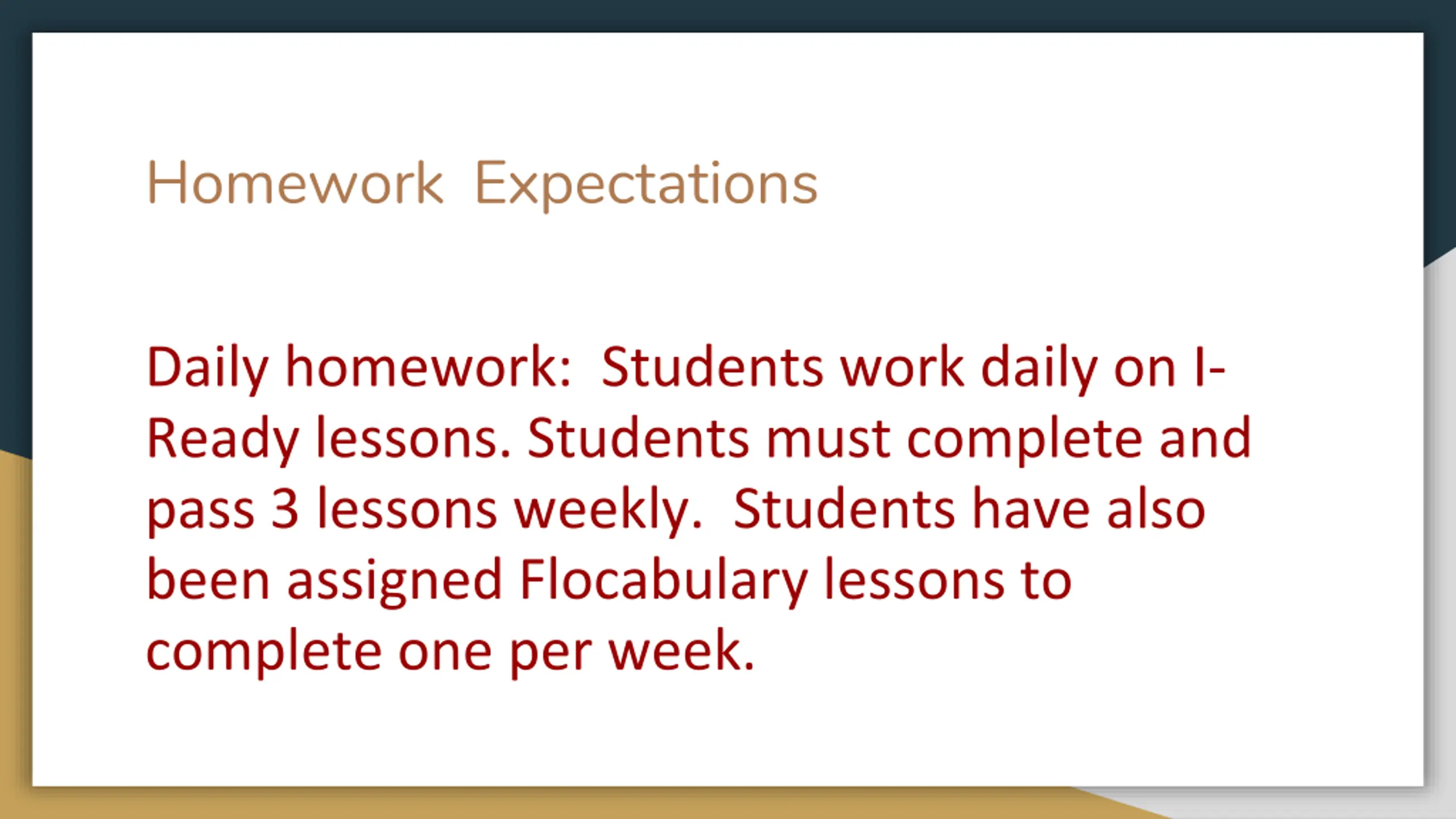 Homework Expectations Daily homework: Students work daily on I- Ready lessons. Students must complete and pass 3 lessons weekly. Students have also been assigned Flocabulary lessons to complete one per week.