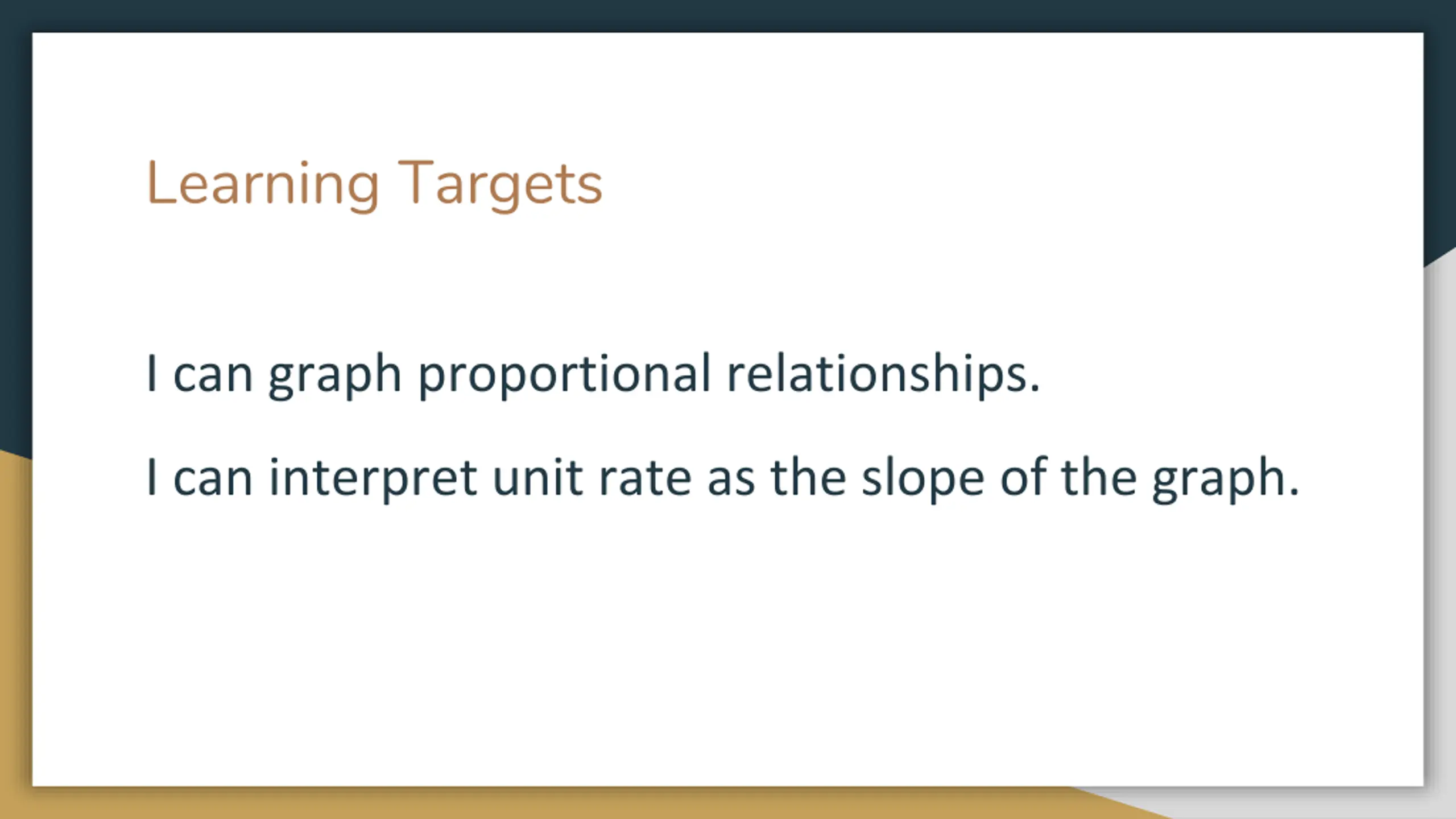 Learning Targets I can graph proportional relationships. I can interpret unit rate as the slope of the graph.
