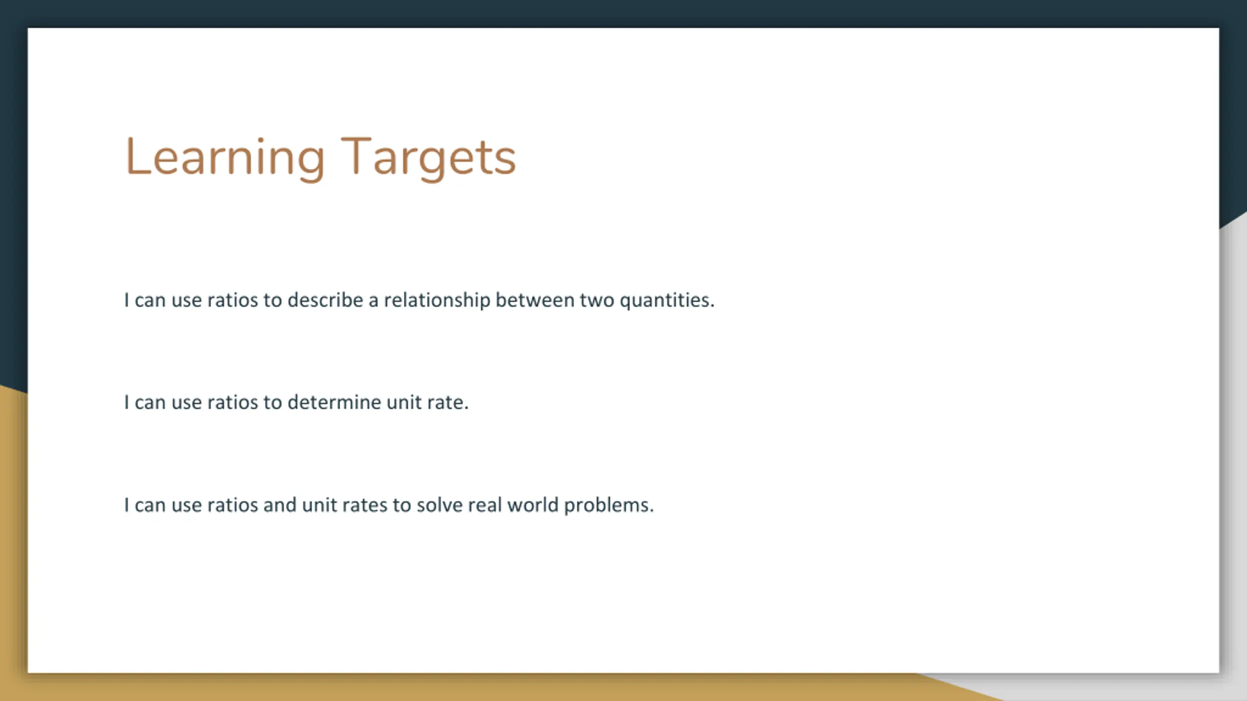 Learning Targets I can use ratios to describe a relationship between two quantities. I can use ratios to determine unit rate. I can use ratios and unit rates to solve real world problems.