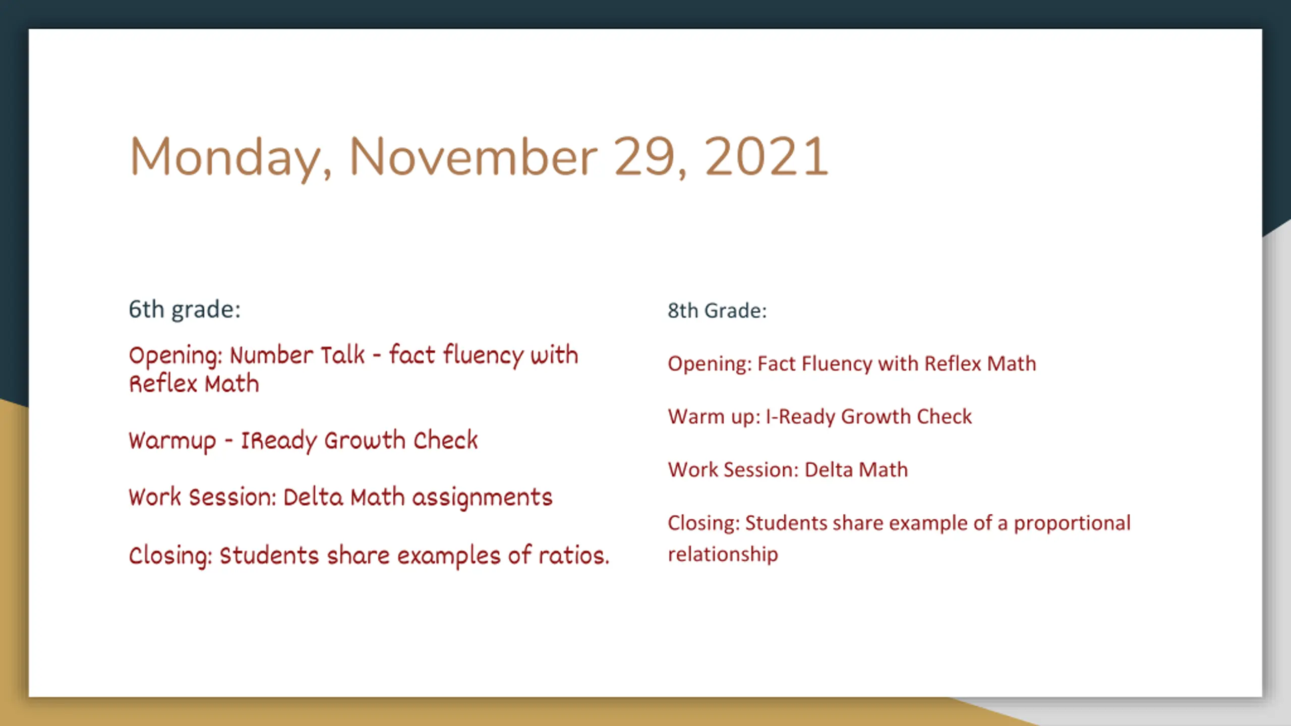 Monday, November 29, 2021 6th grade: Opening: Number Talk - fact fluency with Reflex Math Warmup - IReady Growth Check Work Session: Delta Math assignments 8th Grade: Opening: Fact Fluency with Reflex Math Warm up: I-Ready Growth Check Work Session: Delta Math Closing: Students share example of a proportional relationship Closing: Students share examples of ratios.