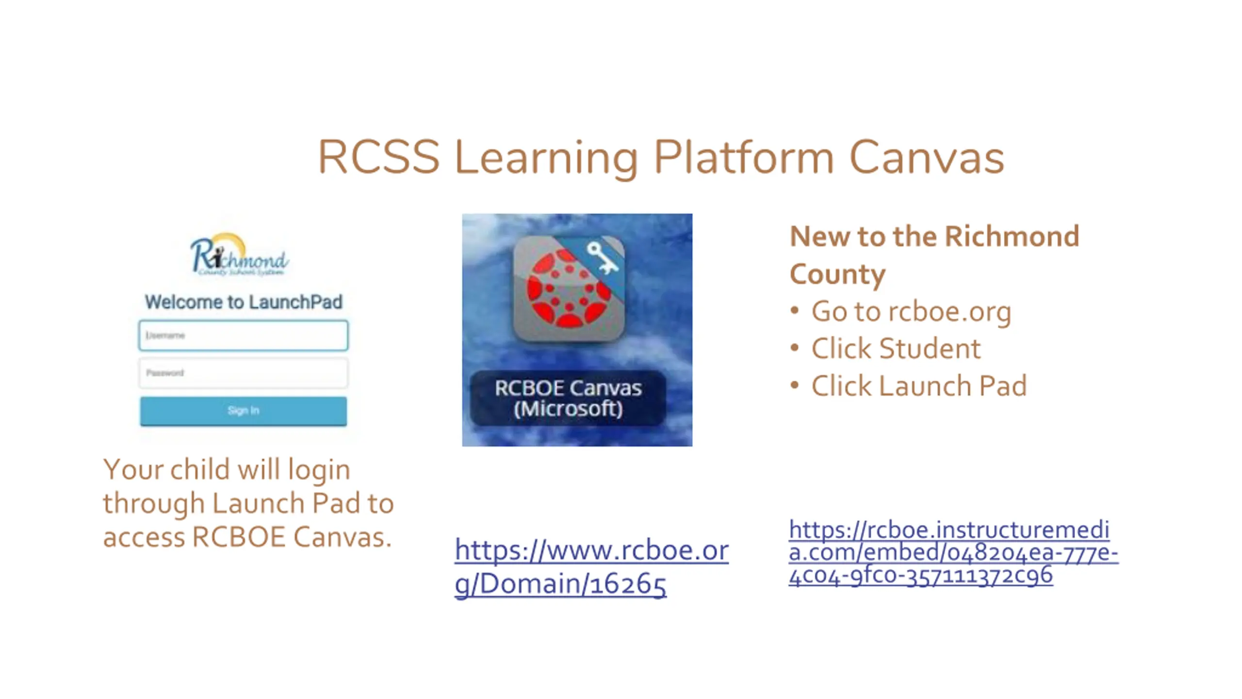 RCSS Learning Platform Canvas New to the Richmond County Go to rcboe.org Click Student Click Launch Pad Watch logging into Canvas as a student. Your child will login through Launch Pad to access RCBOE Canvas. Click link to watch Tutorial Video https://www.rcboe.or g/Domain/16265 https://rcboe.instructuremedi a.com/embed/048204ea-777e- 4c04-9fc0-357111372c96