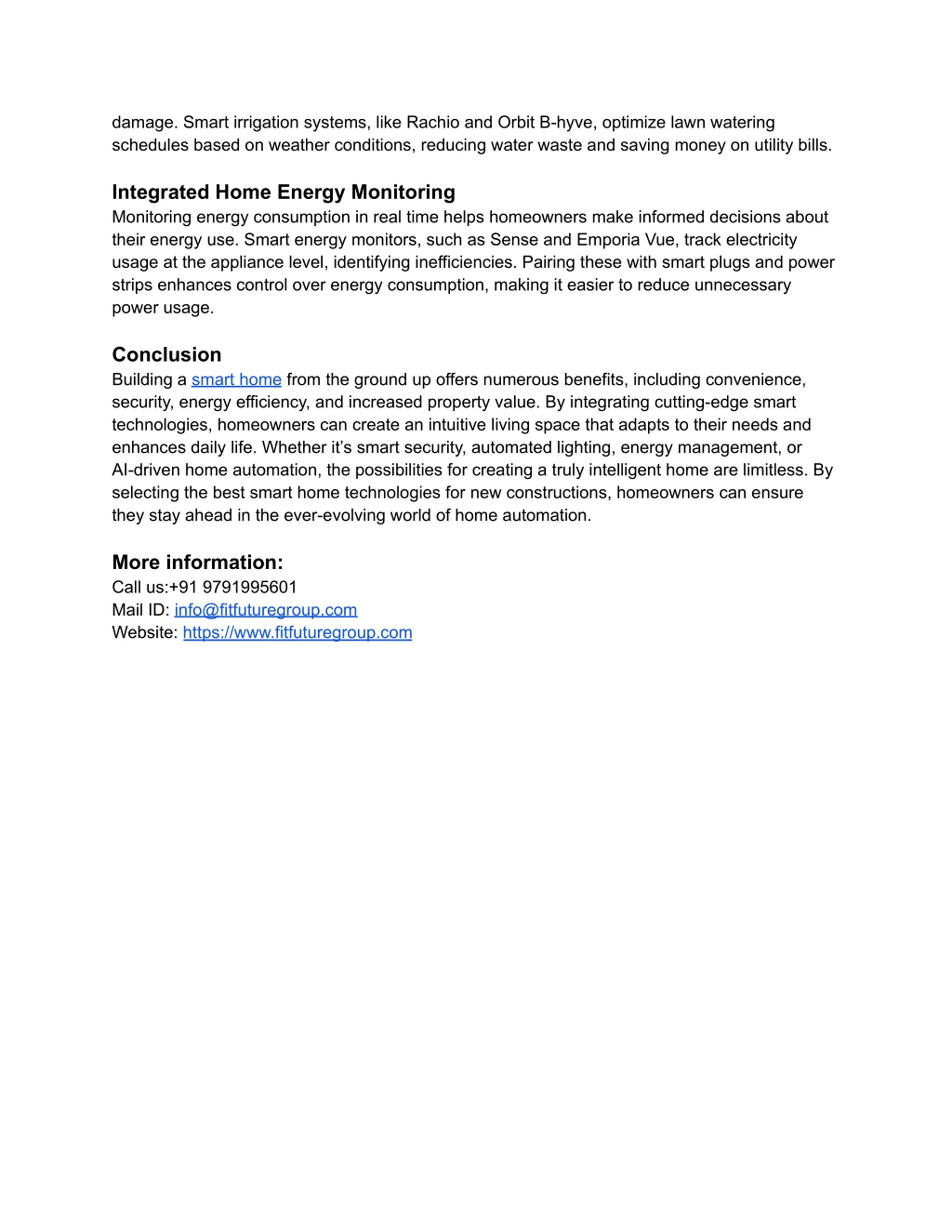 damage. Smart irrigation systems, like Rachio and Orbit B-hyve, optimize lawn watering schedules based on weather conditions, reducing water waste and saving money on utility bills. Integrated Home Energy Monitoring Monitoring energy consumption in real time helps homeowners make informed decisions about their energy use. Smart energy monitors, such as Sense and Emporia Vue, track electricity usage at the appliance level, identifying inefficiencies. Pairing these with smart plugs and power strips enhances control over energy consumption, making it easier to reduce unnecessary power usage. Conclusion Building a smart home from the ground up offers numerous benefits, including convenience, security, energy efficiency, and increased property value. By integrating cutting-edge smart technologies, homeowners can create an intuitive living space that adapts to their needs and enhances daily life. Whether it s smart security, automated lighting, energy management, or AI-driven home automation, the possibilities for creating a truly intelligent home are limitless. By selecting the best smart home technologies for new constructions, homeowners can ensure they stay ahead in the ever-evolving world of home automation. More information: Call us:+91 9791995601 Mail ID: info@fitfuturegroup.com Website: https://www.fitfuturegroup.com
