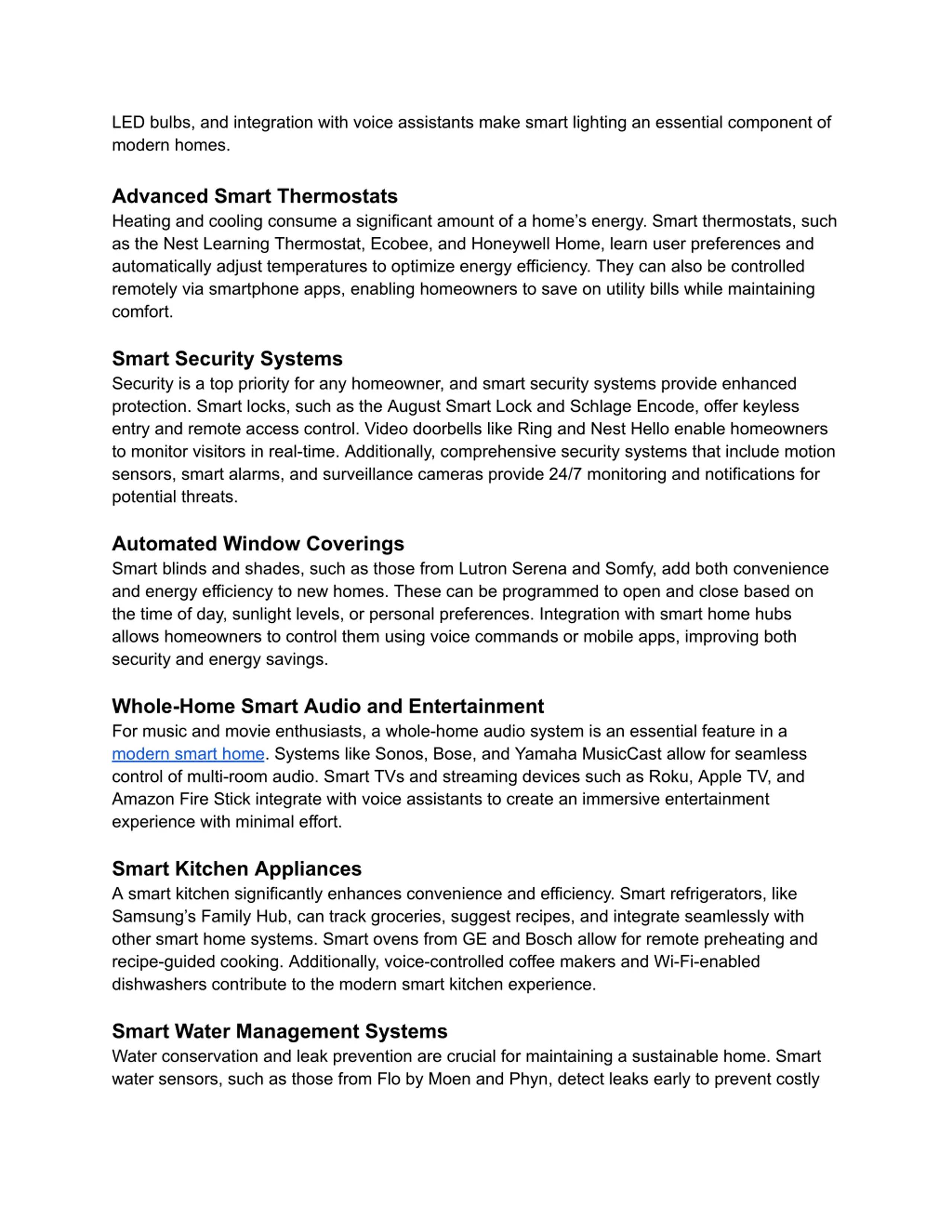 LED bulbs, and integration with voice assistants make smart lighting an essential component of modern homes. Advanced Smart Thermostats Heating and cooling consume a significant amount of a home s energy. Smart thermostats, such as the Nest Learning Thermostat, Ecobee, and Honeywell Home, learn user preferences and automatically adjust temperatures to optimize energy efficiency. They can also be controlled remotely via smartphone apps, enabling homeowners to save on utility bills while maintaining comfort. Smart Security Systems Security is a top priority for any homeowner, and smart security systems provide enhanced protection. Smart locks, such as the August Smart Lock and Schlage Encode, offer keyless entry and remote access control. Video doorbells like Ring and Nest Hello enable homeowners to monitor visitors in real-time. Additionally, comprehensive security systems that include motion sensors, smart alarms, and surveillance cameras provide 24/7 monitoring and notifications for potential threats. Automated Window Coverings Smart blinds and shades, such as those from Lutron Serena and Somfy, add both convenience and energy efficiency to new homes. These can be programmed to open and close based on the time of day, sunlight levels, or personal preferences. Integration with smart home hubs allows homeowners to control them using voice commands or mobile apps, improving both security and energy savings. Whole-Home Smart Audio and Entertainment For music and movie enthusiasts, a whole-home audio system is an essential feature in a modern smart home. Systems like Sonos, Bose, and Yamaha MusicCast allow for seamless control of multi-room audio. Smart TVs and streaming devices such as Roku, Apple TV, and Amazon Fire Stick integrate with voice assistants to create an immersive entertainment experience with minimal effort. Smart Kitchen Appliances A smart kitchen significantly enhances convenience and efficiency. Smart refrigerators, like Samsung s Family Hub, can track groceries, suggest recipes, and integrate seamlessly with other smart home systems. Smart ovens from GE and Bosch allow for remote preheating and recipe-guided cooking. Additionally, voice-controlled coffee makers and Wi-Fi-enabled dishwashers contribute to the modern smart kitchen experience. Smart Water Management Systems Water conservation and leak prevention are crucial for maintaining a sustainable home. Smart water sensors, such as those from Flo by Moen and Phyn, detect leaks early to prevent costly