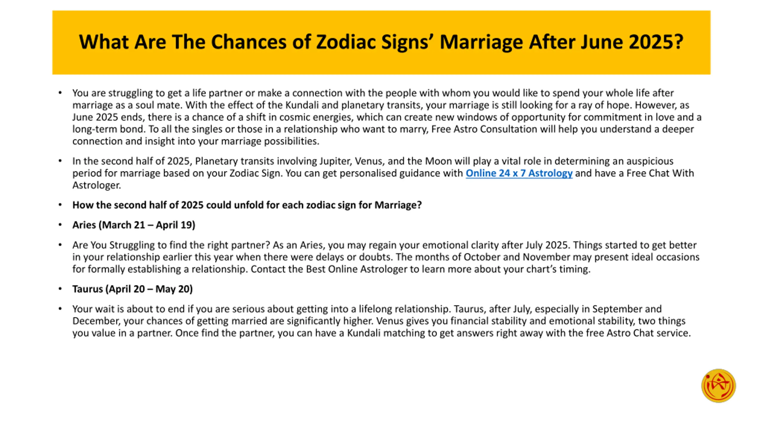 What Are The Chances of Zodiac Signs Marriage After June 2025? You are struggling to get a life partner or make a connection with the people with whom you would like to spend your whole life after marriage as a soul mate. With the effect of the Kundali and planetary transits, your marriage is still looking for a ray of hope. However, as June 2025 ends, there is a chance of a shift in cosmic energies, which can create new windows of opportunity for commitment in love and a long-term bond. To all the singles or those in a relationship who want to marry, Free Astro Consultation will help you understand a deeper connection and insight into your marriage possibilities. In the second half of 2025, Planetary transits involving Jupiter, Venus, and the Moon will play a vital role in determining an auspicious period for marriage based on your Zodiac Sign. You can get personalised guidance with Online 24 x 7 Astrology and have a Free Chat With Astrologer. How the second half of 2025 could unfold for each zodiac sign for Marriage? Aries (March 21 April 19) Are You Struggling to find the right partner? As an Aries, you may regain your emotional clarity after July 2025. Things started to get better in your relationship earlier this year when there were delays or doubts. The months of October and November may present ideal occasions for formally establishing a relationship. Contact the Best Online Astrologer to learn more about your chart s timing. Taurus (April 20 May 20) Your wait is about to end if you are serious about getting into a lifelong relationship. Taurus, after July, especially in September and December, your chances of getting married are significantly higher. Venus gives you financial stability and emotional stability, two things you value in a partner. Once find the partner, you can have a Kundali matching to get answers right away with the free Astro Chat service.