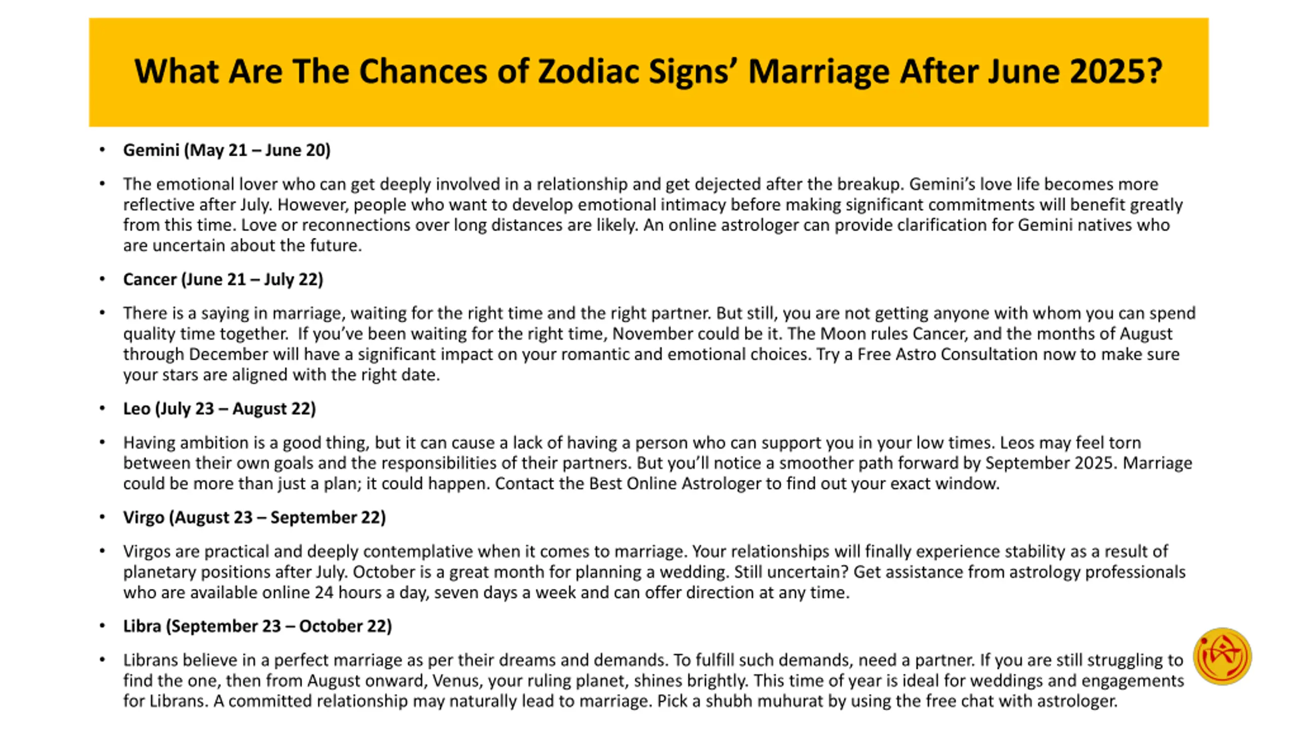 What Are The Chances of Zodiac Signs Marriage After June 2025? Gemini (May 21 June 20) The emotional lover who can get deeply involved in a relationship and get dejected after the breakup. Gemini s love life becomes more reflective after July. However, people who want to develop emotional intimacy before making significant commitments will benefit greatly from this time. Love or reconnections over long distances are likely. An online astrologer can provide clarification for Gemini natives who are uncertain about the future. Cancer (June 21 July 22) There is a saying in marriage, waiting for the right time and the right partner. But still, you are not getting anyone with whom you can spend quality time together. If you ve been waiting for the right time, November could be it. The Moon rules Cancer, and the months of August through December will have a significant impact on your romantic and emotional choices. Try a Free Astro Consultation now to make sure your stars are aligned with the right date. Leo (July 23 August 22) Having ambition is a good thing, but it can cause a lack of having a person who can support you in your low times. Leos may feel torn between their own goals and the responsibilities of their partners. But you ll notice a smoother path forward by September 2025. Marriage could be more than just a plan; it could happen. Contact the Best Online Astrologer to find out your exact window. Virgo (August 23 September 22) Virgos are practical and deeply contemplative when it comes to marriage. Your relationships will finally experience stability as a result of planetary positions after July. October is a great month for planning a wedding. Still uncertain? Get assistance from astrology professionals who are available online 24 hours a day, seven days a week and can offer direction at any time. Libra (September 23 October 22) Librans believe in a perfect marriage as per their dreams and demands. To fulfill such demands, need a partner. If you are still struggling to find the one, then from August onward, Venus, your ruling planet, shines brightly. This time of year is ideal for weddings and engagements for Librans. A committed relationship may naturally lead to marriage. Pick a shubh muhurat by using the free chat with astrologer.