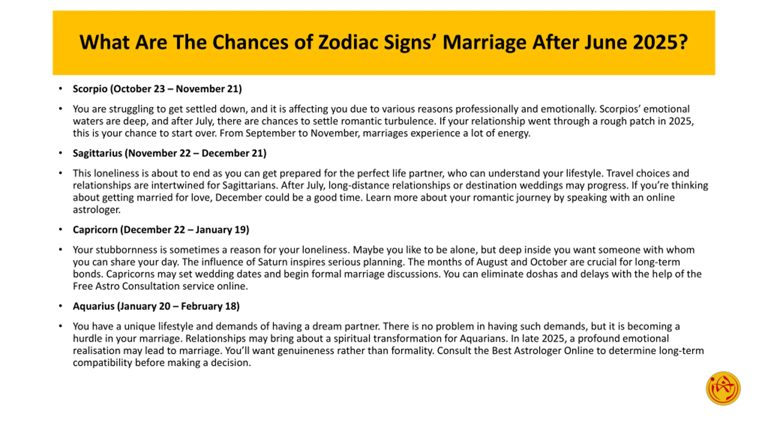 What Are The Chances of Zodiac Signs Marriage After June 2025? Scorpio (October 23 November 21) You are struggling to get settled down, and it is affecting you due to various reasons professionally and emotionally. Scorpios emotional waters are deep, and after July, there are chances to settle romantic turbulence. If your relationship went through a rough patch in 2025, this is your chance to start over. From September to November, marriages experience a lot of energy. Sagittarius (November 22 December 21) This loneliness is about to end as you can get prepared for the perfect life partner, who can understand your lifestyle. Travel choices and relationships are intertwined for Sagittarians. After July, long-distance relationships or destination weddings may progress. If you re thinking about getting married for love, December could be a good time. Learn more about your romantic journey by speaking with an online astrologer. Capricorn (December 22 January 19) Your stubbornness is sometimes a reason for your loneliness. Maybe you like to be alone, but deep inside you want someone with whom you can share your day. The influence of Saturn inspires serious planning. The months of August and October are crucial for long-term bonds. Capricorns may set wedding dates and begin formal marriage discussions. You can eliminate doshas and delays with the help of the Free Astro Consultation service online. Aquarius (January 20 February 18) You have a unique lifestyle and demands of having a dream partner. There is no problem in having such demands, but it is becoming a hurdle in your marriage. Relationships may bring about a spiritual transformation for Aquarians. In late 2025, a profound emotional realisation may lead to marriage. You ll want genuineness rather than formality. Consult the Best Astrologer Online to determine long-term compatibility before making a decision.
