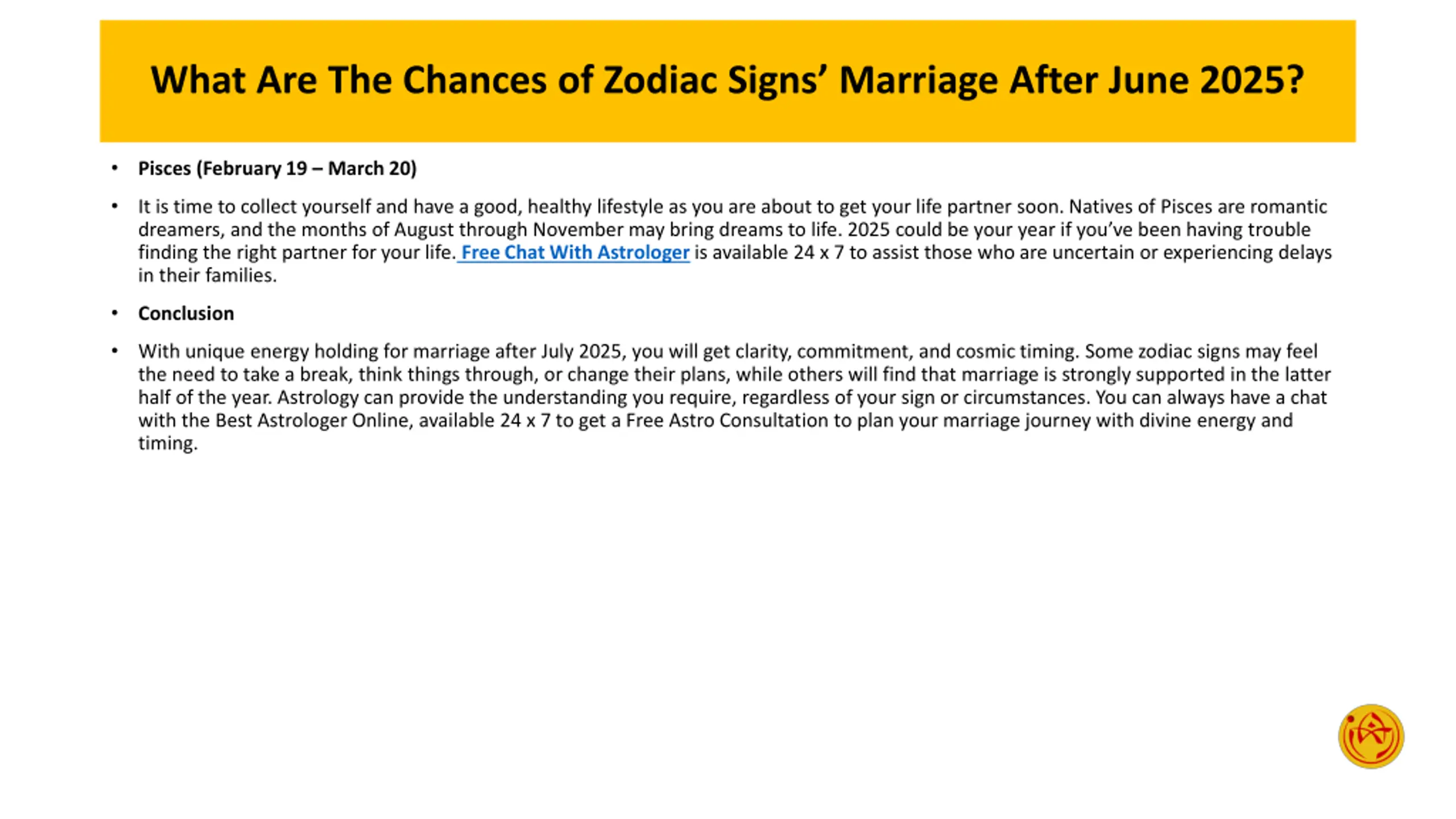 What Are The Chances of Zodiac Signs Marriage After June 2025? Pisces (February 19 March 20) It is time to collect yourself and have a good, healthy lifestyle as you are about to get your life partner soon. Natives of Pisces are romantic dreamers, and the months of August through November may bring dreams to life. 2025 could be your year if you ve been having trouble finding the right partner for your life. Free Chat With Astrologer is available 24 x 7 to assist those who are uncertain or experiencing delays in their families. Conclusion With unique energy holding for marriage after July 2025, you will get clarity, commitment, and cosmic timing. Some zodiac signs may feel the need to take a break, think things through, or change their plans, while others will find that marriage is strongly supported in the latter half of the year. Astrology can provide the understanding you require, regardless of your sign or circumstances. You can always have a chat with the Best Astrologer Online, available 24 x 7 to get a Free Astro Consultation to plan your marriage journey with divine energy and timing.