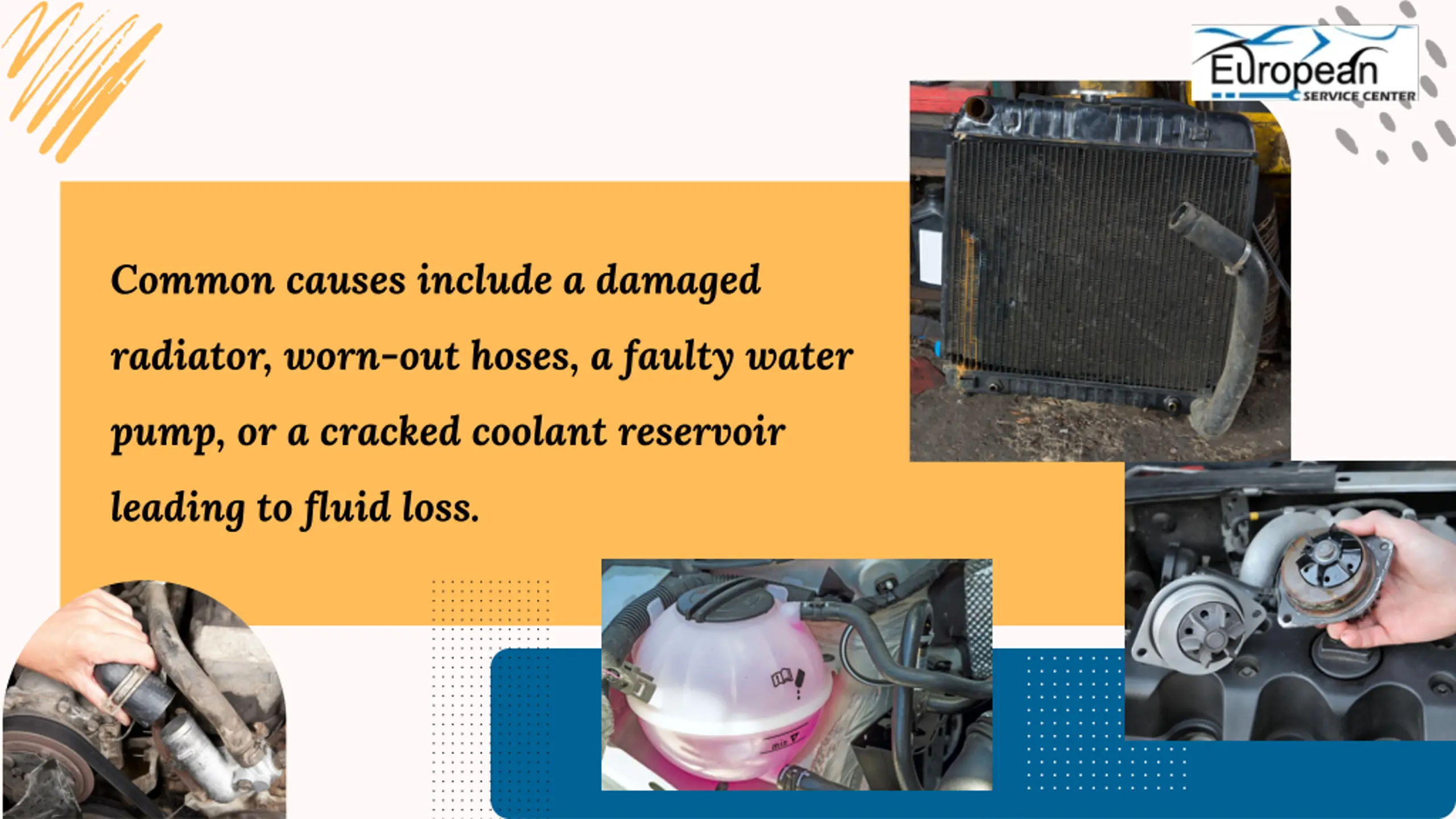 Common causes include a damaged radiator, worn-out hoses, a faulty water pump, or a cracked coolant reservoir leading to fluid loss.