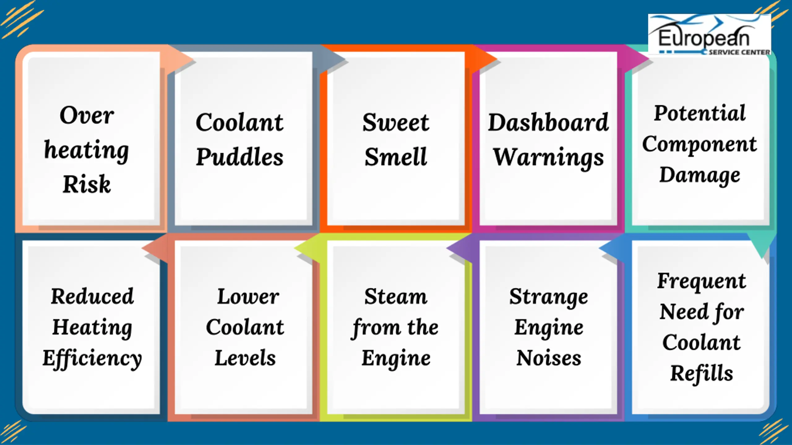Potential Component Damage Over heating Risk Coolant Puddles Sweet Smell Dashboard Warnings Frequent Need for Coolant Refills Reduced Heating Efficiency Lower Coolant Levels Steam from the Engine Strange Engine Noises