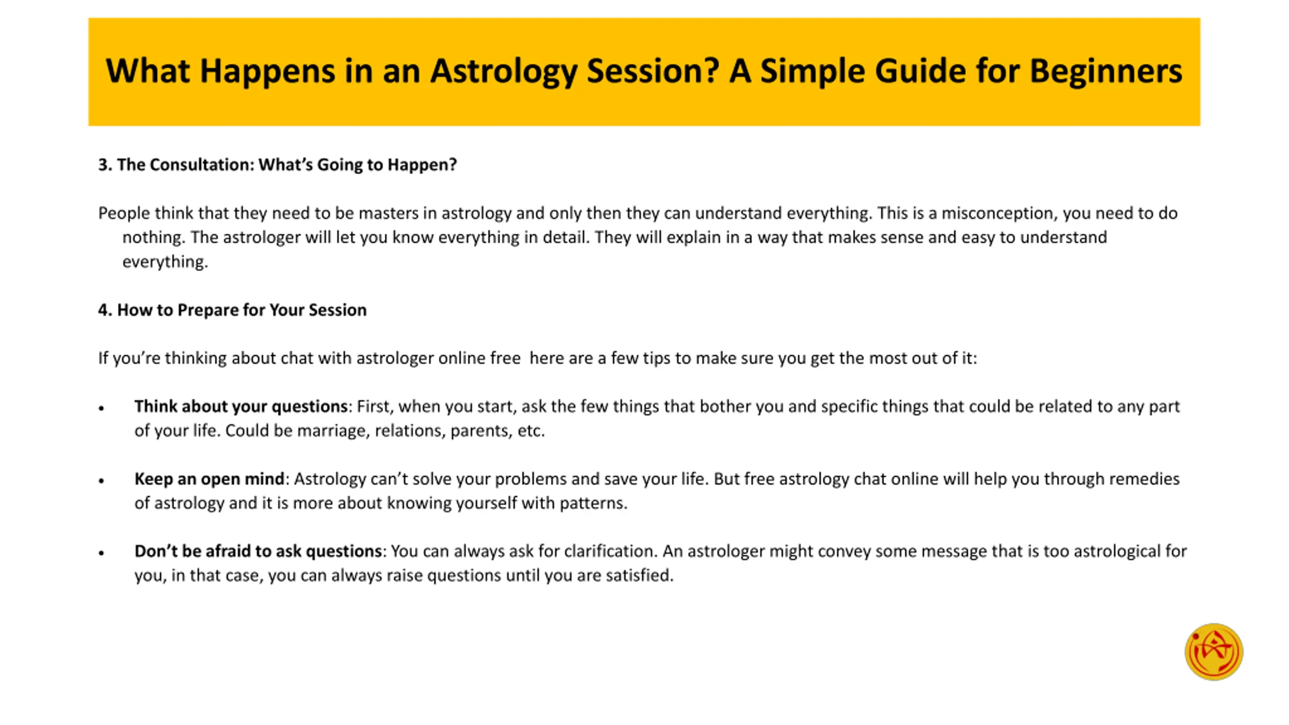 What Happens in an Astrology Session? A Simple Guide for Beginners 3. The Consultation: What s Going to Happen? People think that they need to be masters in astrology and only then they can understand everything. This is a misconception, you need to do nothing. The astrologer will let you know everything in detail. They will explain in a way that makes sense and easy to understand everything. 4. How to Prepare for Your Session If you re thinking about chat with astrologer online free here are a few tips to make sure you get the most out of it: Think about your questions: First, when you start, ask the few things that bother you and specific things that could be related to any part of your life. Could be marriage, relations, parents, etc. Keep an open mind: Astrology can t solve your problems and save your life. But free astrology chat online will help you through remedies of astrology and it is more about knowing yourself with patterns. Don t be afraid to ask questions: You can always ask for clarification. An astrologer might convey some message that is too astrological for you, in that case, you can always raise questions until you are satisfied.
