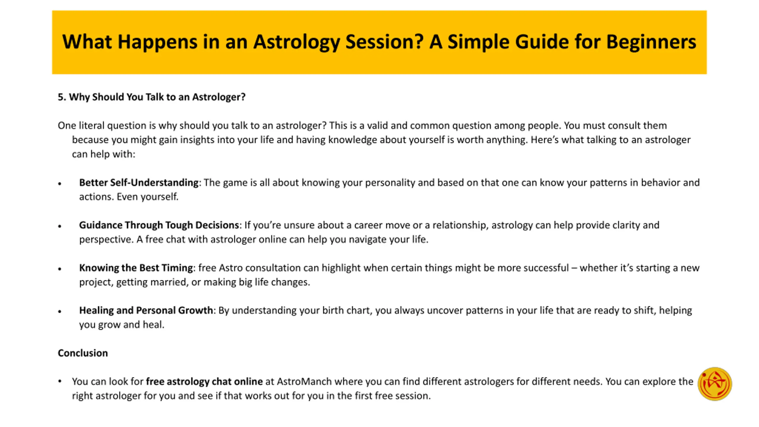 What Happens in an Astrology Session? A Simple Guide for Beginners 5. Why Should You Talk to an Astrologer? One literal question is why should you talk to an astrologer? This is a valid and common question among people. You must consult them because you might gain insights into your life and having knowledge about yourself is worth anything. Here s what talking to an astrologer can help with: Better Self-Understanding: The game is all about knowing your personality and based on that one can know your patterns in behavior and actions. Even yourself. Guidance Through Tough Decisions: If you re unsure about a career move or a relationship, astrology can help provide clarity and perspective. A free chat with astrologer online can help you navigate your life. Knowing the Best Timing: free Astro consultation can highlight when certain things might be more successful whether it s starting a new project, getting married, or making big life changes. Healing and Personal Growth: By understanding your birth chart, you always uncover patterns in your life that are ready to shift, helping you grow and heal. Conclusion You can look for free astrology chat online at AstroManch where you can find different astrologers for different needs. You can explore the right astrologer for you and see if that works out for you in the first free session.