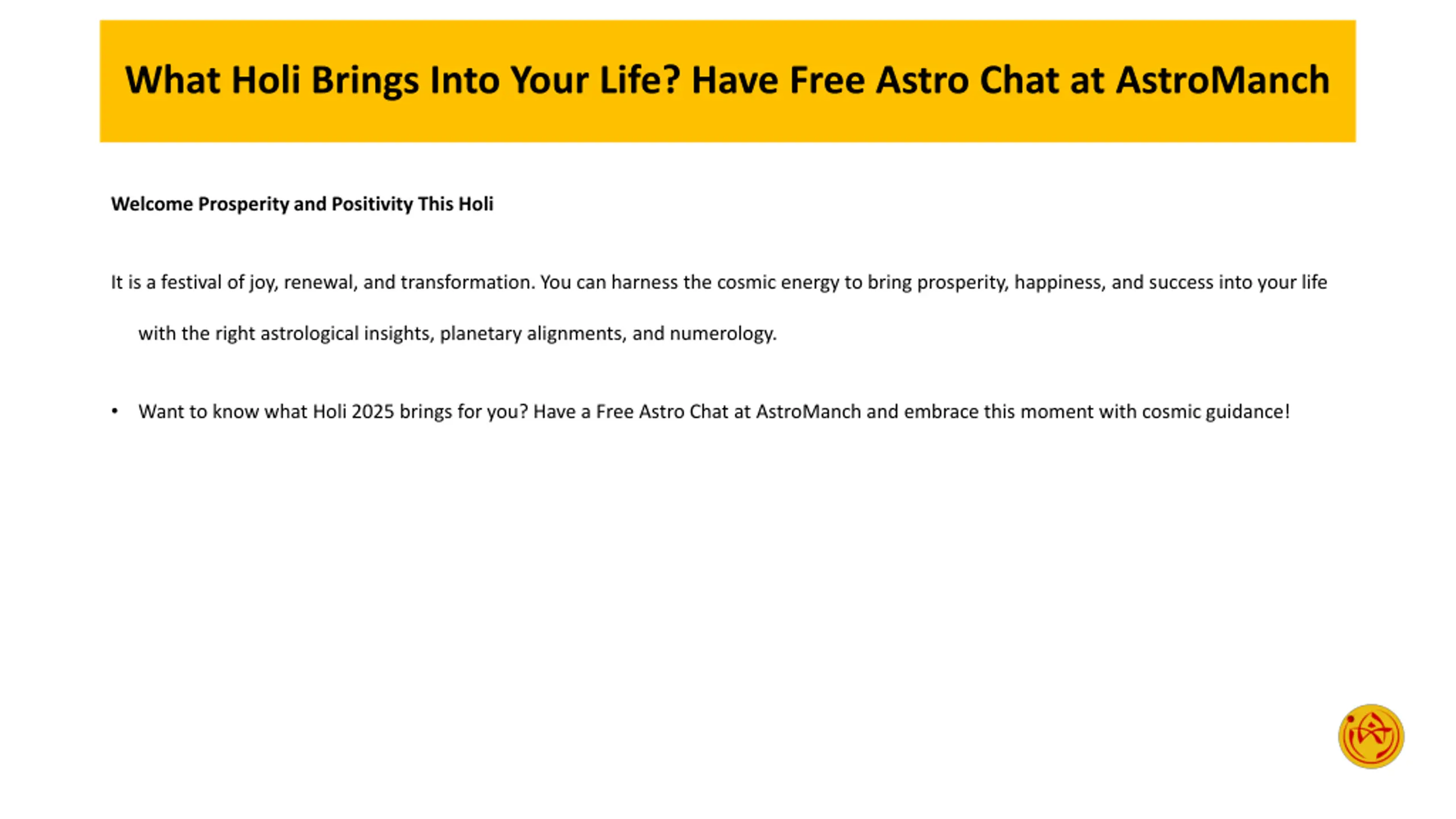 What Holi Brings Into Your Life? Have Free Astro Chat at AstroManch The Holi festival is enjoyed with colours and fascinating cuisines bringing joy to our lives. It signifies renewal and positivity to symbolise the victory of good over evil. It is the festive arrival of spring and a great time to mend your relationship with your family. But have you ever thought about Holi s astrological and numerological significance? Or the effect of planetary alignment on your life during this time! Let's discover the deeper significance of Holi 2025 into your life with a Free Chat with Astrologer at AstroManch to define your destiny. Significance of Holi Beyond Colours Burning Holika represents the annihilation of negative energies to embrace new beginnings. The History of Holi is associated with Lord Vishnu and his devotee Prahlad. It symbolises faith and devotion to overpower negativity. How Prahalad survived when put into fire with Holika. Holika Dahan 2025 Date: 13th March (Thursday) Holika Dahan Muhurat Time: 11:26 PM, 13 Mar to 12:29 AM, Mar 14 From an astrological perspective, 1. Holi occurs when the Sun crosses Pisces and the Moon aligns with Leo. 2. It promotes emotional cleansing and self-growth. 3. This planetary alignment during this festival encourages transformation. 4. It is an ideal time to set clear intentions and break free from past challenges.