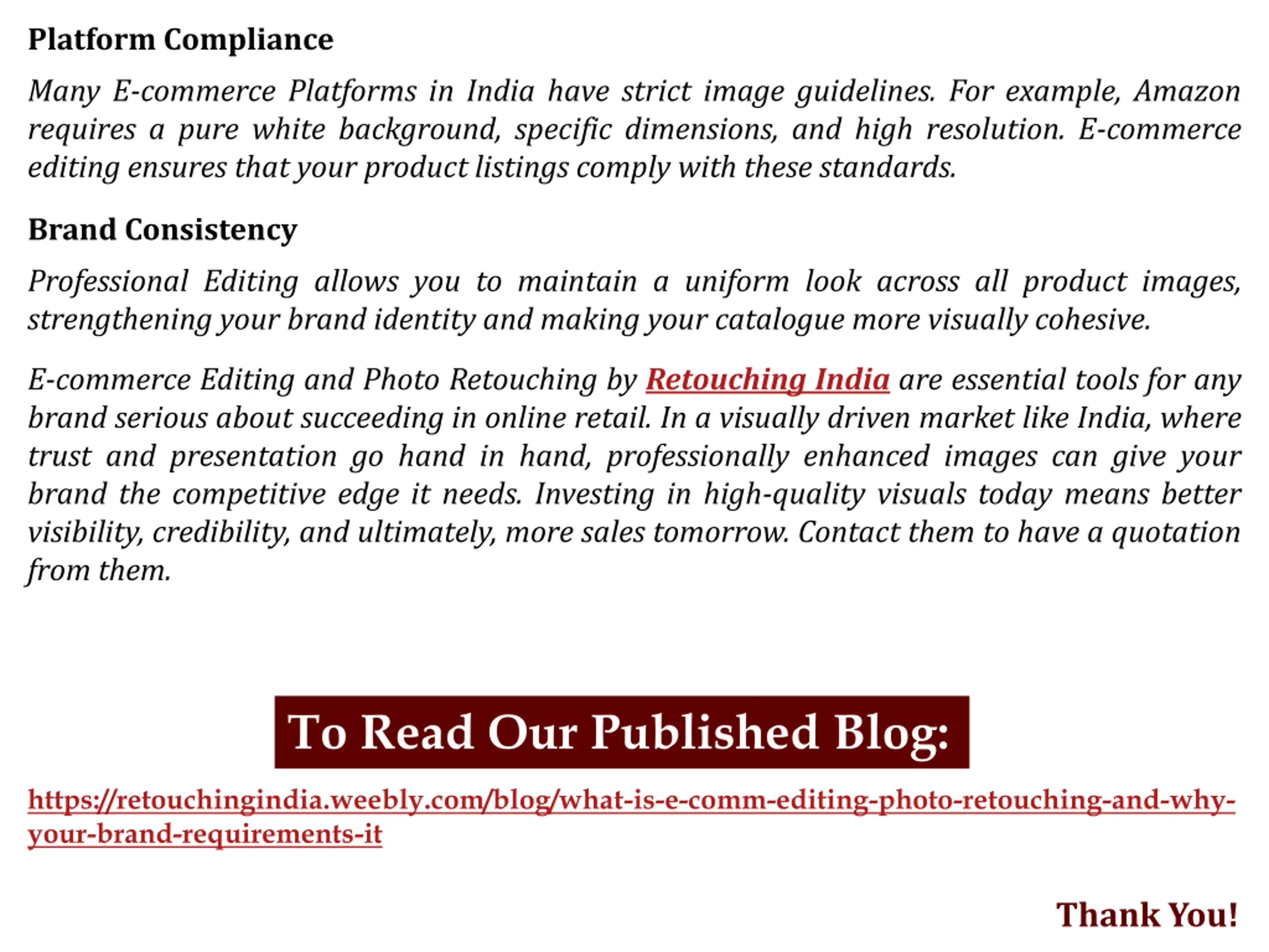 Platform Compliance Many E-commerce Platforms in India have strict image guidelines. For example, Amazon requires a pure white background, specific dimensions, and high resolution. E-commerce editing ensures that your product listings comply with these standards. Brand Consistency Professional Editing allows you to maintain a uniform look across all product images, strengthening your brand identity and making your catalogue more visually cohesive. E-commerce Editing and Photo Retouching by Retouching India are essential tools for any brand serious about succeeding in online retail. In a visually driven market like India, where trust and presentation go hand in hand, professionally enhanced images can give your brand the competitive edge it needs. Investing in high-quality visuals today means better visibility, credibility, and ultimately, more sales tomorrow. Contact them to have a quotation from them. To Read Our Published Blog: https://retouchingindia.weebly.com/blog/what-is-e-comm-editing-photo-retouching-and-why- your-brand-requirements-it Thank You!
