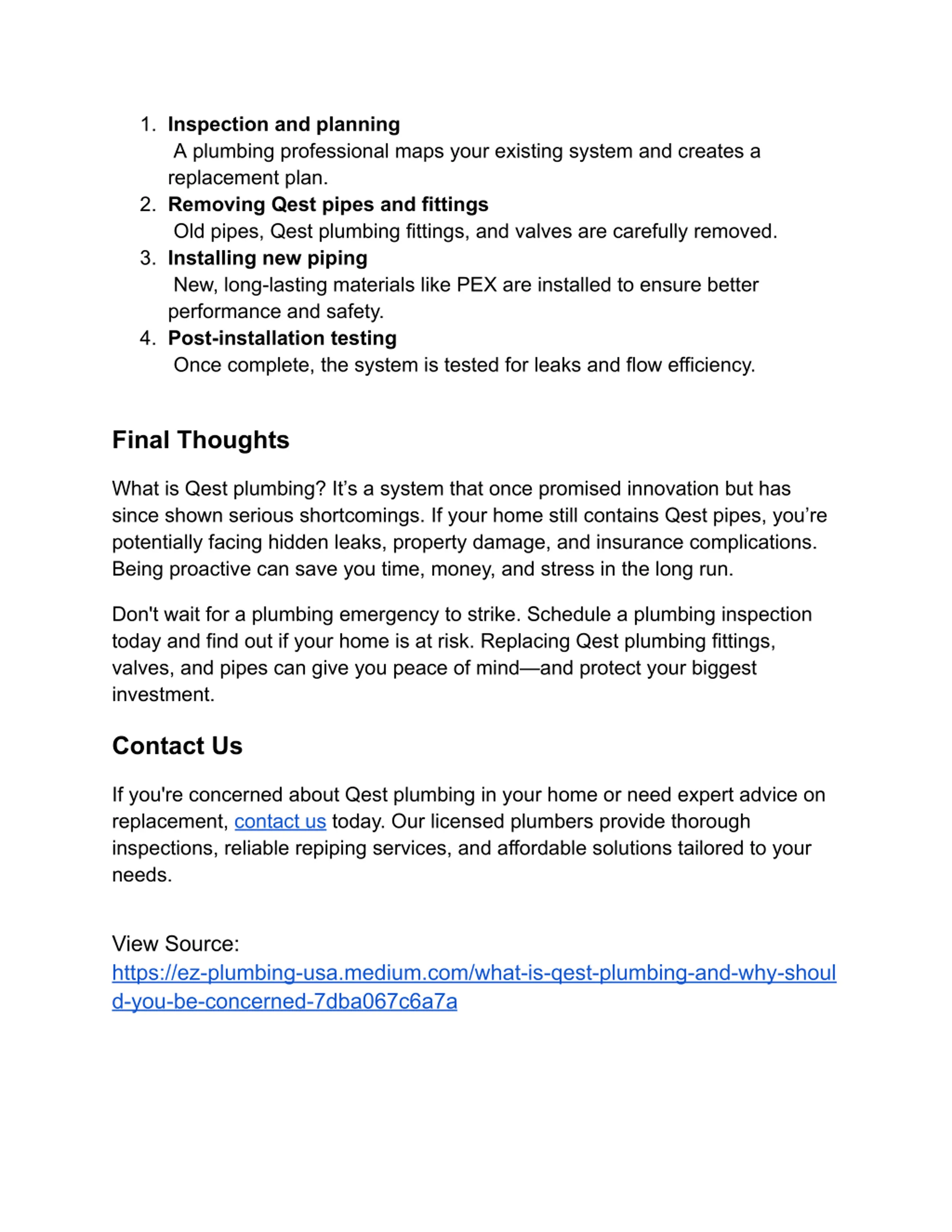 1. Inspection and planning A plumbing professional maps your existing system and creates a replacement plan. 2. Removing Qest pipes and fittings Old pipes, Qest plumbing fittings, and valves are carefully removed. 3. Installing new piping New, long-lasting materials like PEX are installed to ensure better performance and safety. 4. Post-installation testing Once complete, the system is tested for leaks and flow efficiency. Final Thoughts What is Qest plumbing? It s a system that once promised innovation but has since shown serious shortcomings. If your home still contains Qest pipes, you re potentially facing hidden leaks, property damage, and insurance complications. Being proactive can save you time, money, and stress in the long run. Don't wait for a plumbing emergency to strike. Schedule a plumbing inspection today and find out if your home is at risk. Replacing Qest plumbing fittings, valves, and pipes can give you peace of mind and protect your biggest investment. Contact Us If you're concerned about Qest plumbing in your home or need expert advice on replacement, contact us today. Our licensed plumbers provide thorough inspections, reliable repiping services, and affordable solutions tailored to your needs. View Source: https://ez-plumbing-usa.medium.com/what-is-qest-plumbing-and-why-shoul d-you-be-concerned-7dba067c6a7a