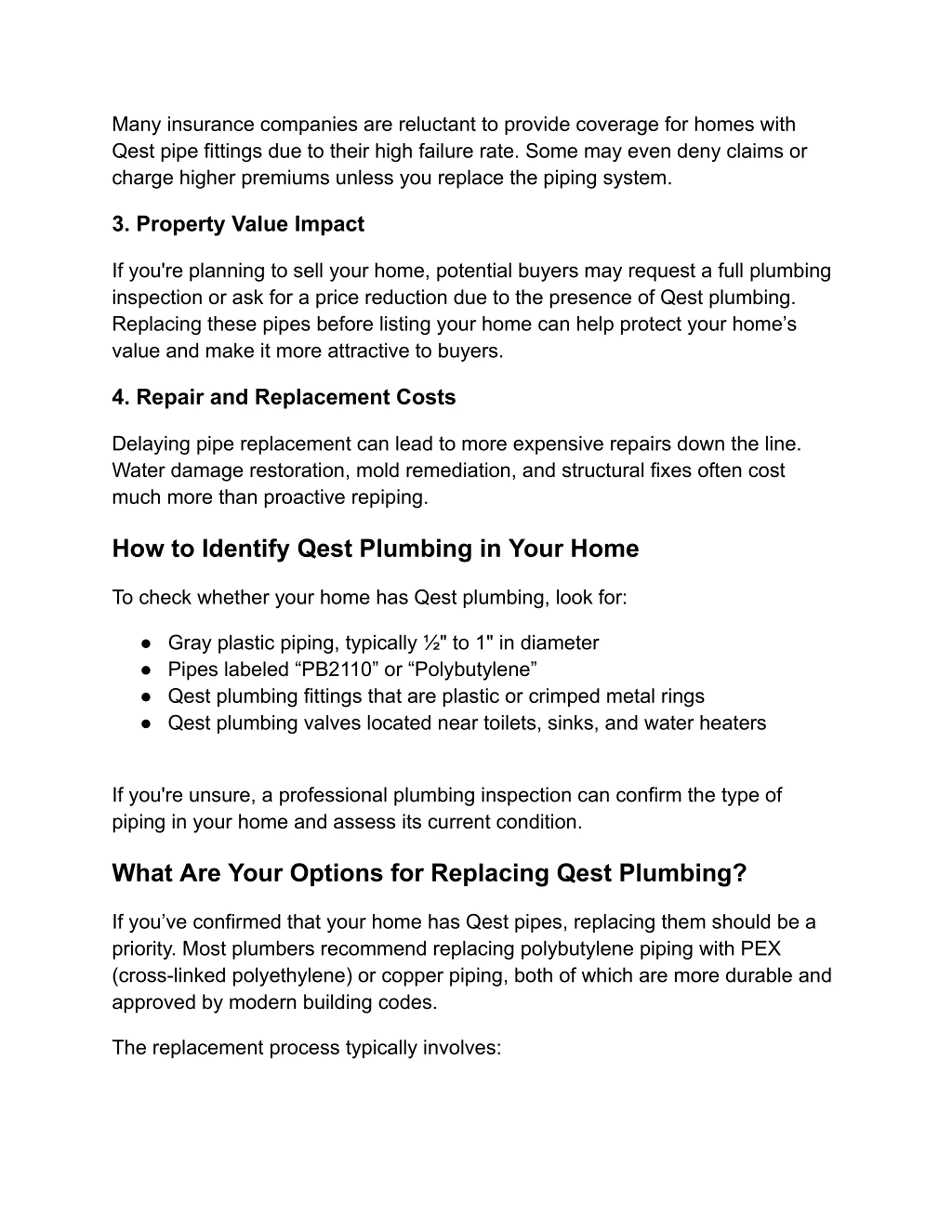 Many insurance companies are reluctant to provide coverage for homes with Qest pipe fittings due to their high failure rate. Some may even deny claims or charge higher premiums unless you replace the piping system. 3. Property Value Impact If you're planning to sell your home, potential buyers may request a full plumbing inspection or ask for a price reduction due to the presence of Qest plumbing. Replacing these pipes before listing your home can help protect your home s value and make it more attractive to buyers. 4. Repair and Replacement Costs Delaying pipe replacement can lead to more expensive repairs down the line. Water damage restoration, mold remediation, and structural fixes often cost much more than proactive repiping. How to Identify Qest Plumbing in Your Home To check whether your home has Qest plumbing, look for: Gray plastic piping, typically " to 1" in diameter Pipes labeled PB2110 or Polybutylene Qest plumbing fittings that are plastic or crimped metal rings Qest plumbing valves located near toilets, sinks, and water heaters If you're unsure, a professional plumbing inspection can confirm the type of piping in your home and assess its current condition. What Are Your Options for Replacing Qest Plumbing? If you ve confirmed that your home has Qest pipes, replacing them should be a priority. Most plumbers recommend replacing polybutylene piping with PEX (cross-linked polyethylene) or copper piping, both of which are more durable and approved by modern building codes. The replacement process typically involves: