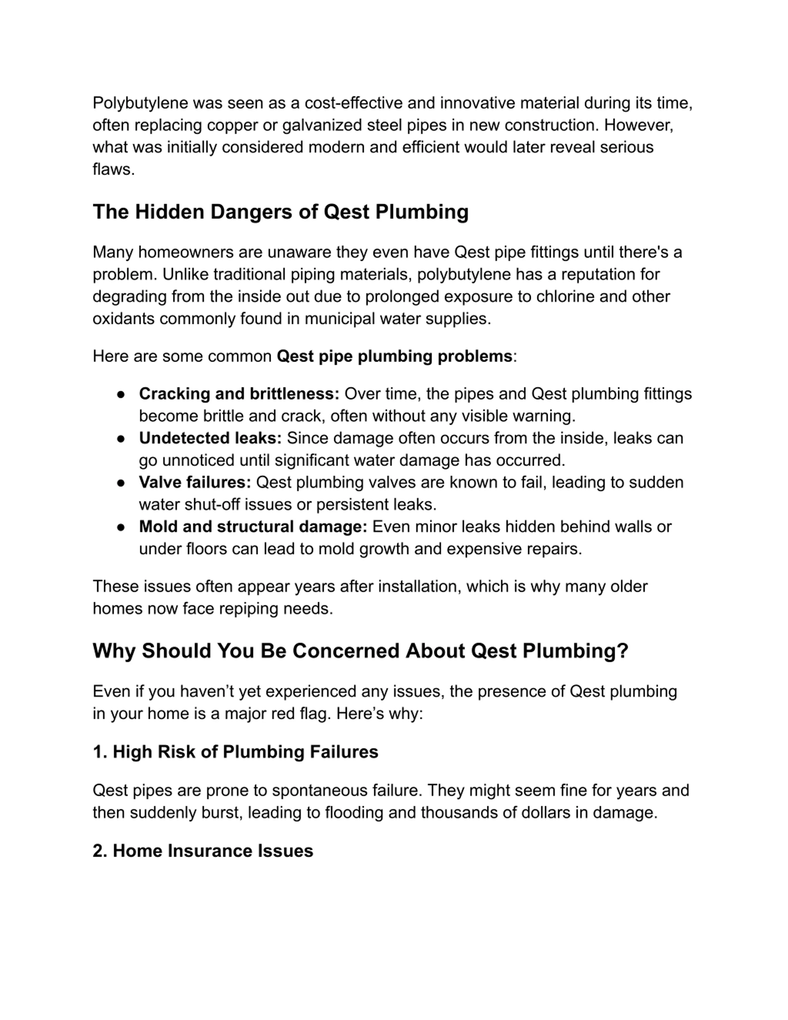 Polybutylene was seen as a cost-effective and innovative material during its time, often replacing copper or galvanized steel pipes in new construction. However, what was initially considered modern and efficient would later reveal serious flaws. The Hidden Dangers of Qest Plumbing Many homeowners are unaware they even have Qest pipe fittings until there's a problem. Unlike traditional piping materials, polybutylene has a reputation for degrading from the inside out due to prolonged exposure to chlorine and other oxidants commonly found in municipal water supplies. Here are some common Qest pipe plumbing problems: Cracking and brittleness: Over time, the pipes and Qest plumbing fittings become brittle and crack, often without any visible warning. Undetected leaks: Since damage often occurs from the inside, leaks can go unnoticed until significant water damage has occurred. Valve failures: Qest plumbing valves are known to fail, leading to sudden water shut-off issues or persistent leaks. Mold and structural damage: Even minor leaks hidden behind walls or under floors can lead to mold growth and expensive repairs. These issues often appear years after installation, which is why many older homes now face repiping needs. Why Should You Be Concerned About Qest Plumbing? Even if you haven t yet experienced any issues, the presence of Qest plumbing in your home is a major red flag. Here s why: 1. High Risk of Plumbing Failures Qest pipes are prone to spontaneous failure. They might seem fine for years and then suddenly burst, leading to flooding and thousands of dollars in damage. 2. Home Insurance Issues