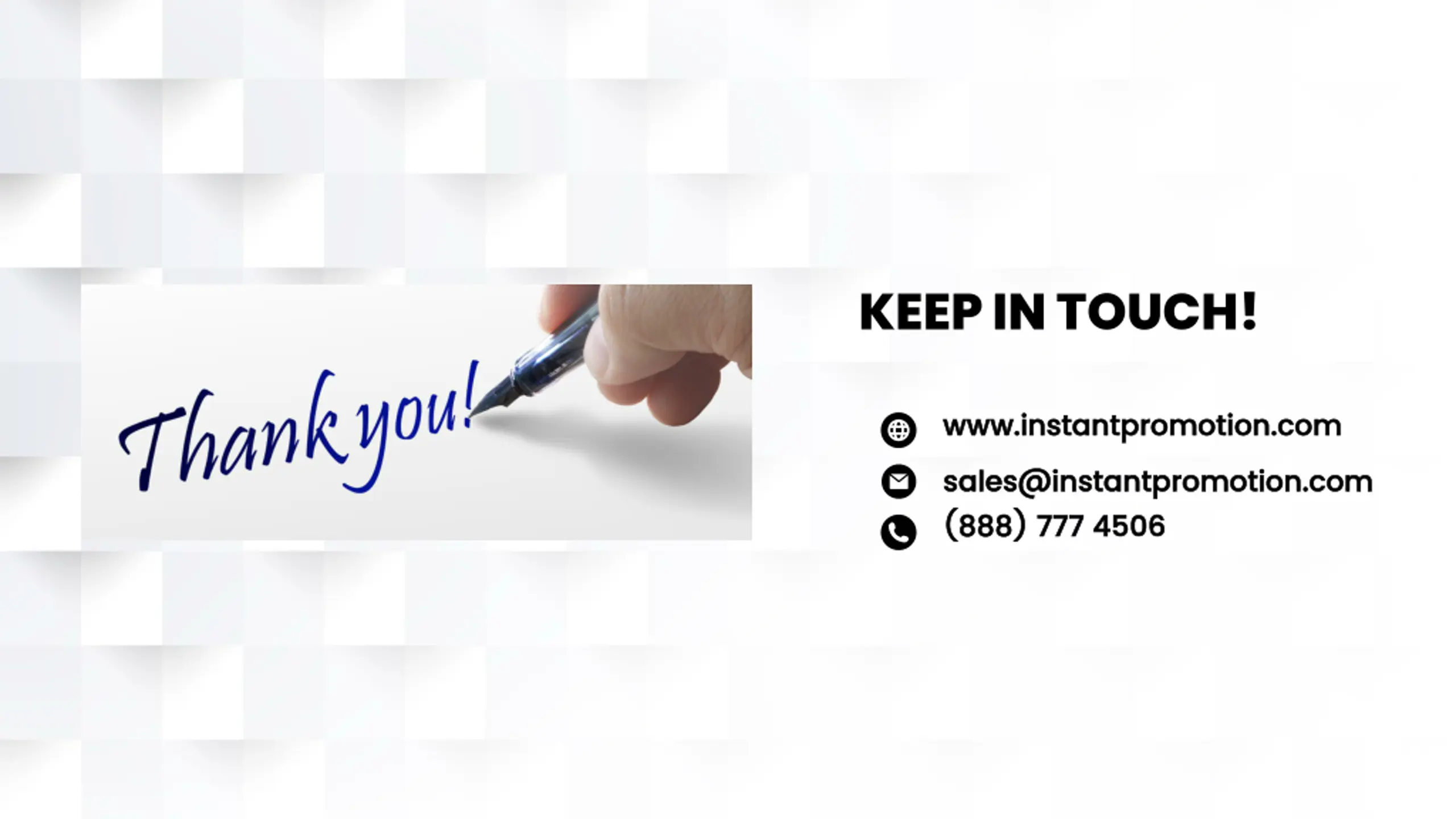 KEEP IN TOUCH! www www. .instantpromotion instantpromotion. .com com sales@instantpromotion sales@instantpromotion. .com ( (888 888) ) 777 777 4506 4506 com