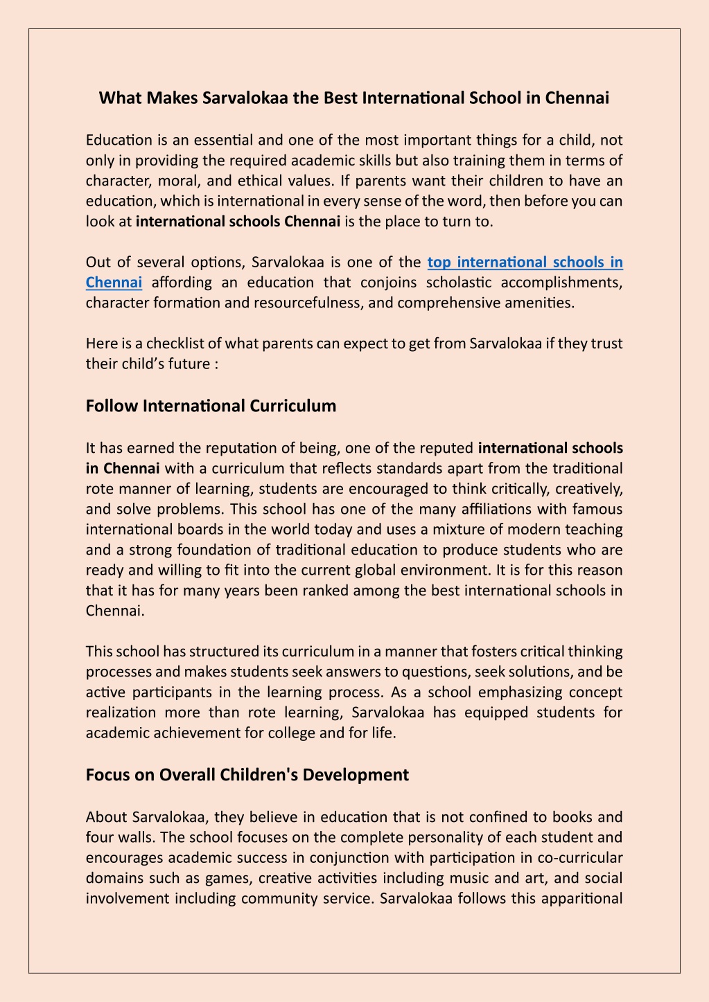 What Makes Sarvalokaa the Best International School in Chennai Education is an essential and one of the most important things for a child, not only in providing the required academic skills but also training them in terms of character, moral, and ethical values. If parents want their children to have an education, which is international in every sense of the word, then before you can look at international schools Chennai is the place to turn to. Out of several options, Sarvalokaa is one of the top international schools in Chennai affording an education that conjoins scholastic accomplishments, character formation and resourcefulness, and comprehensive amenities. Here is a checklist of what parents can expect to get from Sarvalokaa if they trust their child s future : Follow International Curriculum It has earned the reputation of being, one of the reputed international schools in Chennai with a curriculum that reflects standards apart from the traditional rote manner of learning, students are encouraged to think critically, creatively, and solve problems. This school has one of the many affiliations with famous international boards in the world today and uses a mixture of modern teaching and a strong foundation of traditional education to produce students who are ready and willing to fit into the current global environment. It is for this reason that it has for many years been ranked among the best international schools in Chennai. This school has structured its curriculum in a manner that fosters critical thinking processes and makes students seek answers to questions, seek solutions, and be active participants in the learning process. As a school emphasizing concept realization more than rote learning, Sarvalokaa has equipped students for academic achievement for college and for life. Focus on Overall Children's Development About Sarvalokaa, they believe in education that is not confined to books and four walls. The school focuses on the complete personality of each student and encourages academic success in conjunction with participation in co-curricular domains such as games, creative activities including music and art, and social involvement including community service. Sarvalokaa follows this apparitional