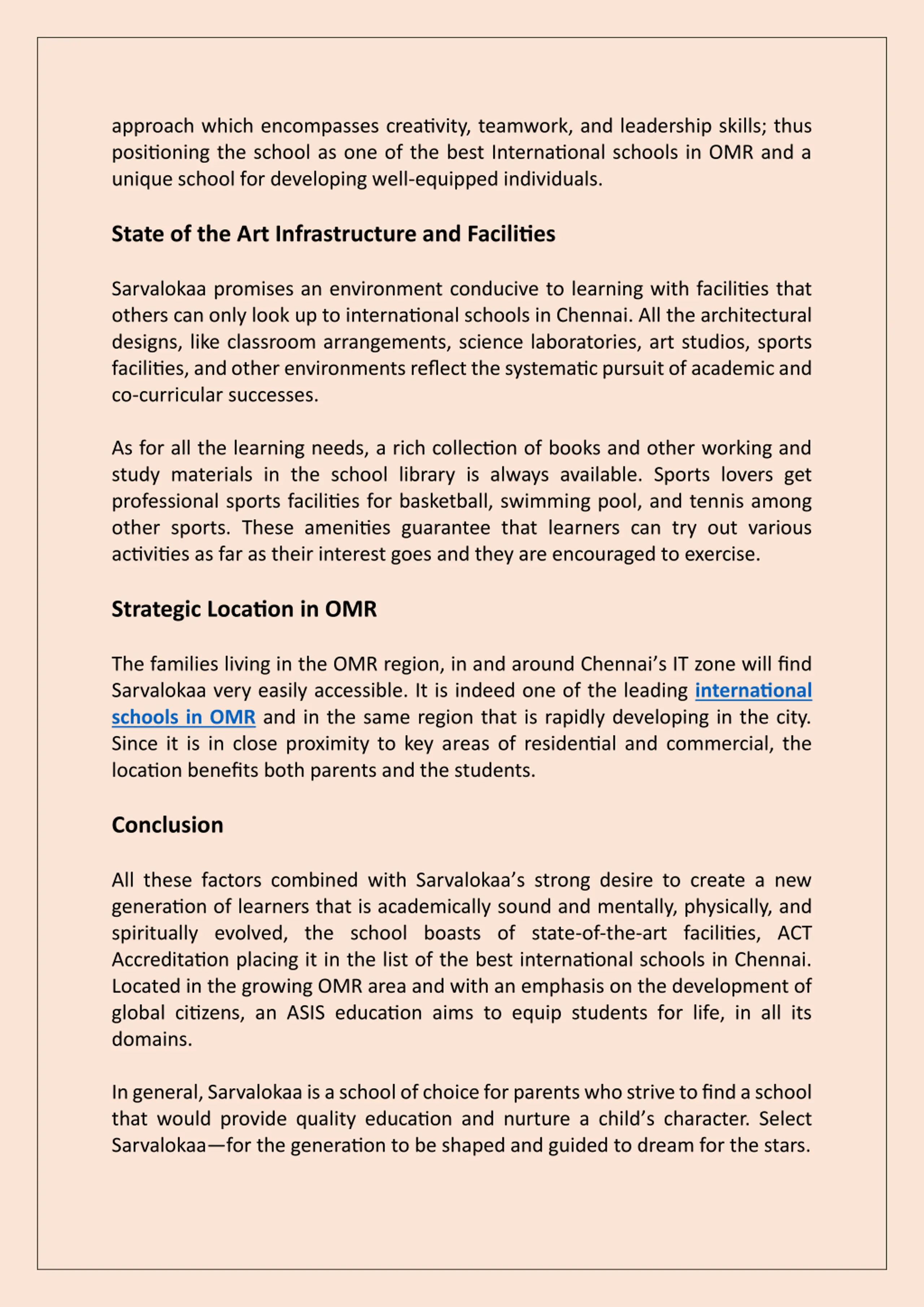 approach which encompasses creativity, teamwork, and leadership skills; thus positioning the school as one of the best International schools in OMR and a unique school for developing well-equipped individuals. State of the Art Infrastructure and Facilities Sarvalokaa promises an environment conducive to learning with facilities that others can only look up to international schools in Chennai. All the architectural designs, like classroom arrangements, science laboratories, art studios, sports facilities, and other environments reflect the systematic pursuit of academic and co-curricular successes. As for all the learning needs, a rich collection of books and other working and study materials in the school library is always available. Sports lovers get professional sports facilities for basketball, swimming pool, and tennis among other sports. These amenities guarantee that learners can try out various activities as far as their interest goes and they are encouraged to exercise. Strategic Location in OMR The families living in the OMR region, in and around Chennai s IT zone will find Sarvalokaa very easily accessible. It is indeed one of the leading international schools in OMR and in the same region that is rapidly developing in the city. Since it is in close proximity to key areas of residential and commercial, the location benefits both parents and the students. Conclusion All these factors combined with Sarvalokaa s strong desire to create a new generation of learners that is academically sound and mentally, physically, and spiritually evolved, the school boasts of state-of-the-art facilities, ACT Accreditation placing it in the list of the best international schools in Chennai. Located in the growing OMR area and with an emphasis on the development of global citizens, an ASIS education aims to equip students for life, in all its domains. In general, Sarvalokaa is a school of choice for parents who strive to find a school that would provide quality education and nurture a child s character. Select Sarvalokaa for the generation to be shaped and guided to dream for the stars.
