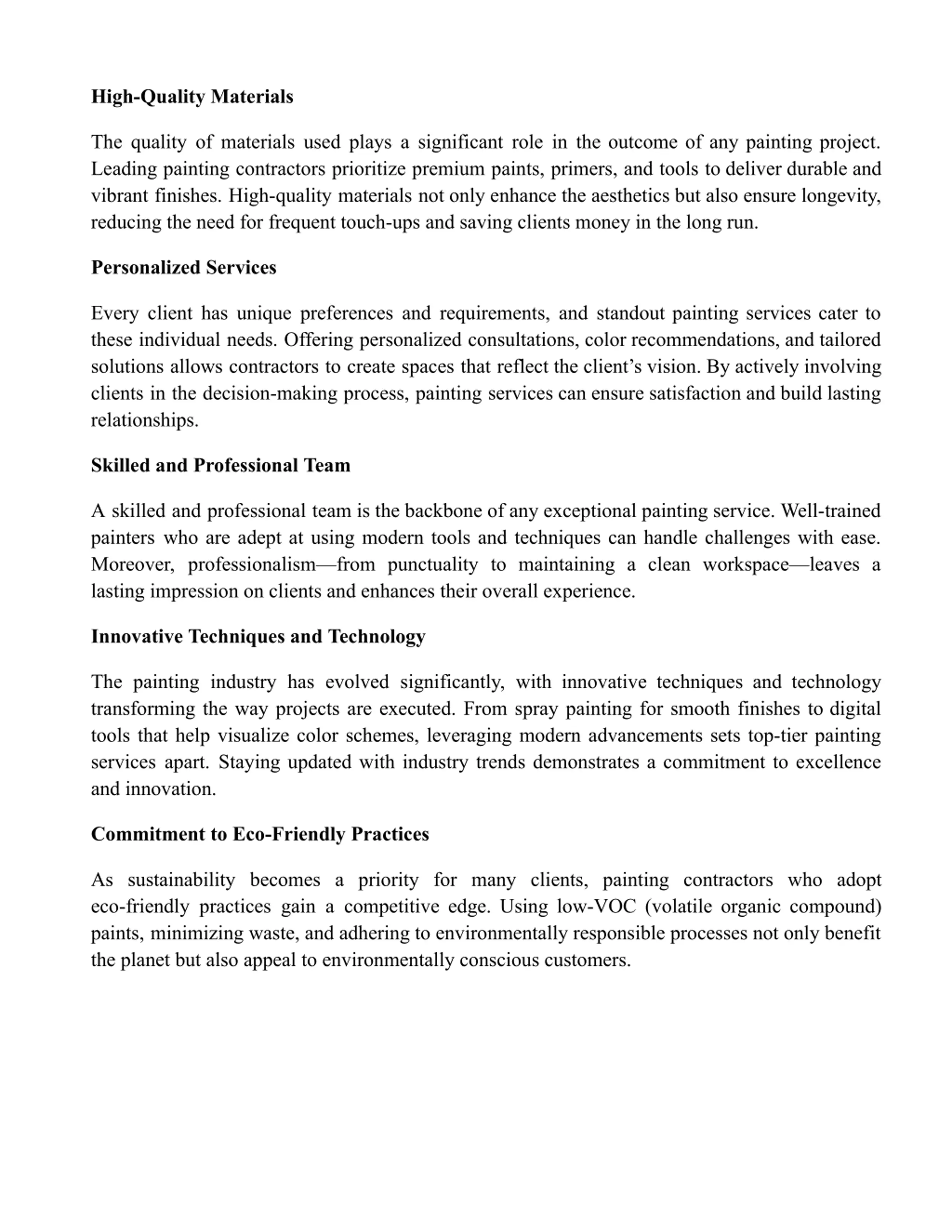 High-Quality Materials The quality of materials used plays a significant role in the outcome of any painting project. Leading painting contractors prioritize premium paints, primers, and tools to deliver durable and vibrant finishes. High-quality materials not only enhance the aesthetics but also ensure longevity, reducing the need for frequent touch-ups and saving clients money in the long run. Personalized Services Every client has unique preferences and requirements, and standout painting services cater to these individual needs. Offering personalized consultations, color recommendations, and tailored solutions allows contractors to create spaces that reflect the client s vision. By actively involving clients in the decision-making process, painting services can ensure satisfaction and build lasting relationships. Skilled and Professional Team A skilled and professional team is the backbone of any exceptional painting service. Well-trained painters who are adept at using modern tools and techniques can handle challenges with ease. Moreover, professionalism from punctuality to maintaining a clean workspace leaves a lasting impression on clients and enhances their overall experience. Innovative Techniques and Technology The painting industry has evolved significantly, with innovative techniques and technology transforming the way projects are executed. From spray painting for smooth finishes to digital tools that help visualize color schemes, leveraging modern advancements sets top-tier painting services apart. Staying updated with industry trends demonstrates a commitment to excellence and innovation. Commitment to Eco-Friendly Practices As sustainability becomes a priority for many clients, painting contractors who adopt eco-friendly practices gain a competitive edge. Using low-VOC (volatile organic compound) paints, minimizing waste, and adhering to environmentally responsible processes not only benefit the planet but also appeal to environmentally conscious customers.