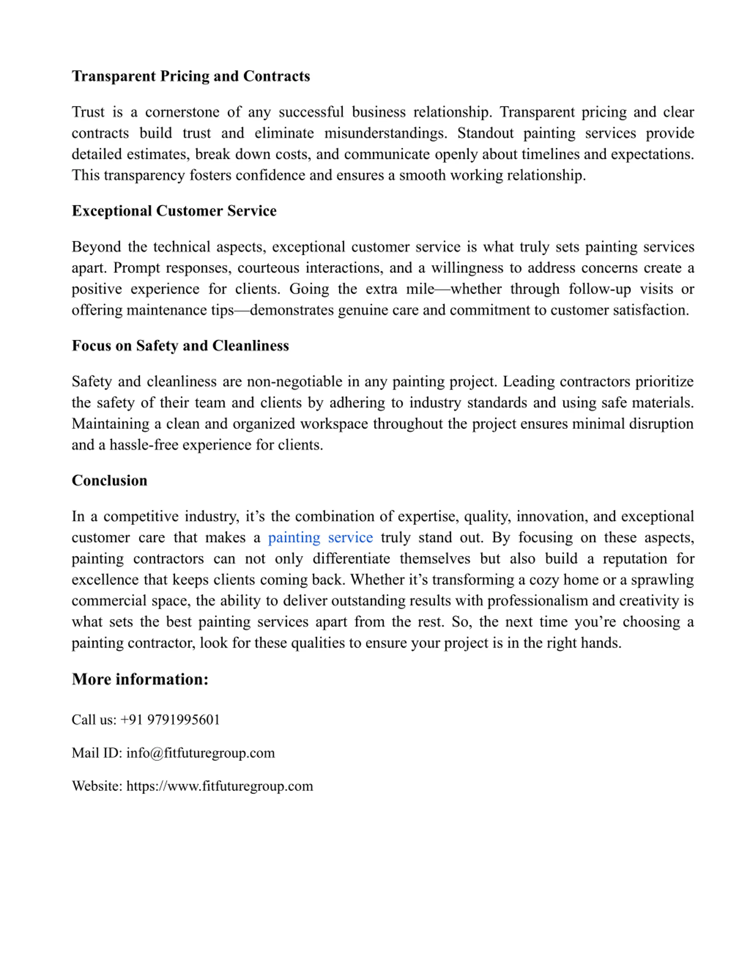 Transparent Pricing and Contracts Trust is a cornerstone of any successful business relationship. Transparent pricing and clear contracts build trust and eliminate misunderstandings. Standout painting services provide detailed estimates, break down costs, and communicate openly about timelines and expectations. This transparency fosters confidence and ensures a smooth working relationship. Exceptional Customer Service Beyond the technical aspects, exceptional customer service is what truly sets painting services apart. Prompt responses, courteous interactions, and a willingness to address concerns create a positive experience for clients. Going the extra mile whether through follow-up visits or offering maintenance tips demonstrates genuine care and commitment to customer satisfaction. Focus on Safety and Cleanliness Safety and cleanliness are non-negotiable in any painting project. Leading contractors prioritize the safety of their team and clients by adhering to industry standards and using safe materials. Maintaining a clean and organized workspace throughout the project ensures minimal disruption and a hassle-free experience for clients. Conclusion In a competitive industry, it s the combination of expertise, quality, innovation, and exceptional customer care that makes a painting service truly stand out. By focusing on these aspects, painting contractors can not only differentiate themselves but also build a reputation for excellence that keeps clients coming back. Whether it s transforming a cozy home or a sprawling commercial space, the ability to deliver outstanding results with professionalism and creativity is what sets the best painting services apart from the rest. So, the next time you re choosing a painting contractor, look for these qualities to ensure your project is in the right hands. More information: Call us: +91 9791995601 Mail ID: info@fitfuturegroup.com Website: https://www.fitfuturegroup.com