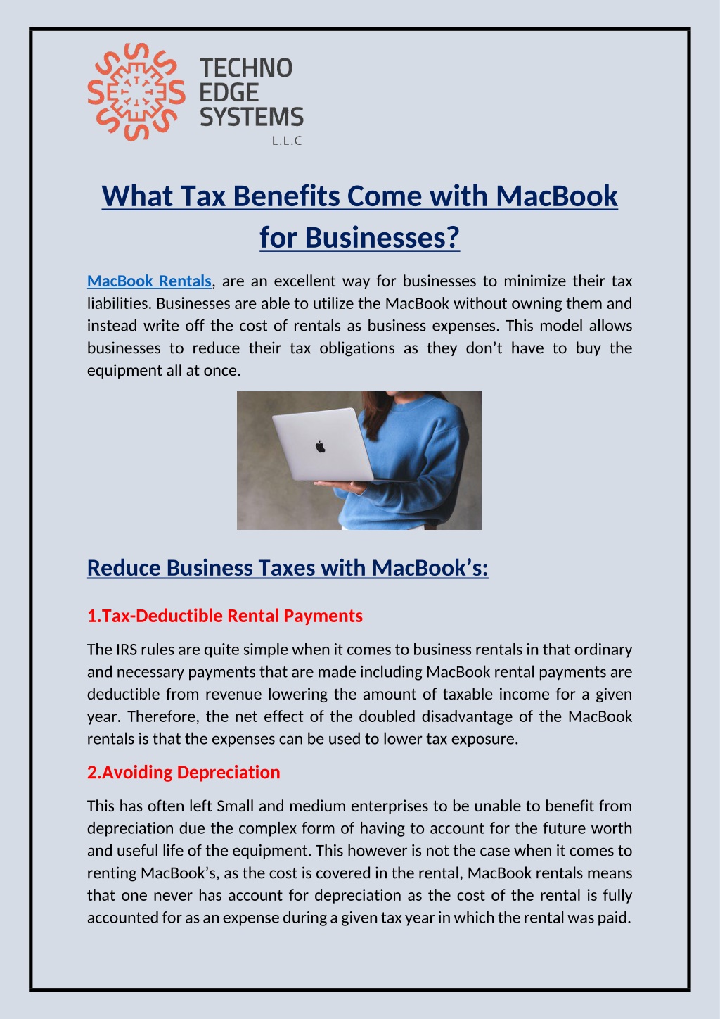 In This PDF, What Tax Benefits Come with MacBook for Businesses? over traditional financing methods for cost-efficiency and flexibility in business operations. Techno Edge Systems LLC offers the reliable services of MacBook Rentals Dubai. Contact Us