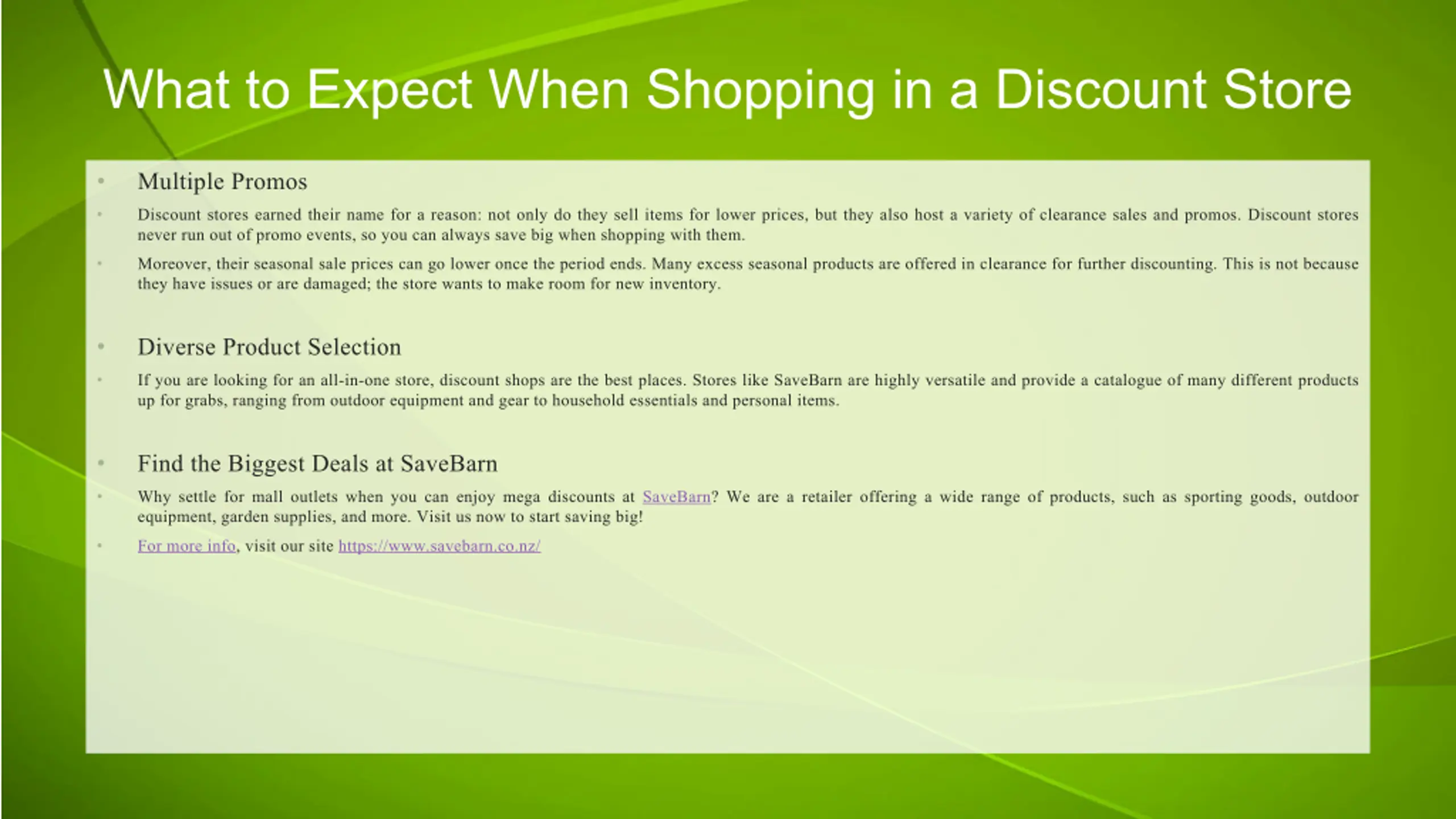 What to Expect When Shopping in a Discount Store Multiple Promos Discount stores earned their name for a reason: not only do they sell items for lower prices, but they also host a variety of clearance sales and promos. Discount stores never run out of promo events, so you can always save big when shopping with them. Moreover, their seasonal sale prices can go lower once the period ends. Many excess seasonal products are offered in clearance for further discounting. This is not because they have issues or are damaged; the store wants to make room for new inventory. Diverse Product Selection If you are looking for an all-in-one store, discount shops are the best places. Stores like SaveBarn are highly versatile and provide a catalogue of many different products up for grabs, ranging from outdoor equipment and gear to household essentials and personal items. Find the Biggest Deals at SaveBarn Why settle for mall outlets when you can enjoy mega discounts at SaveBarn? We are a retailer offering a wide range of products, such as sporting goods, outdoor equipment, garden supplies, and more. Visit us now to start saving big! For more info, visit our site https://www.savebarn.co.nz/