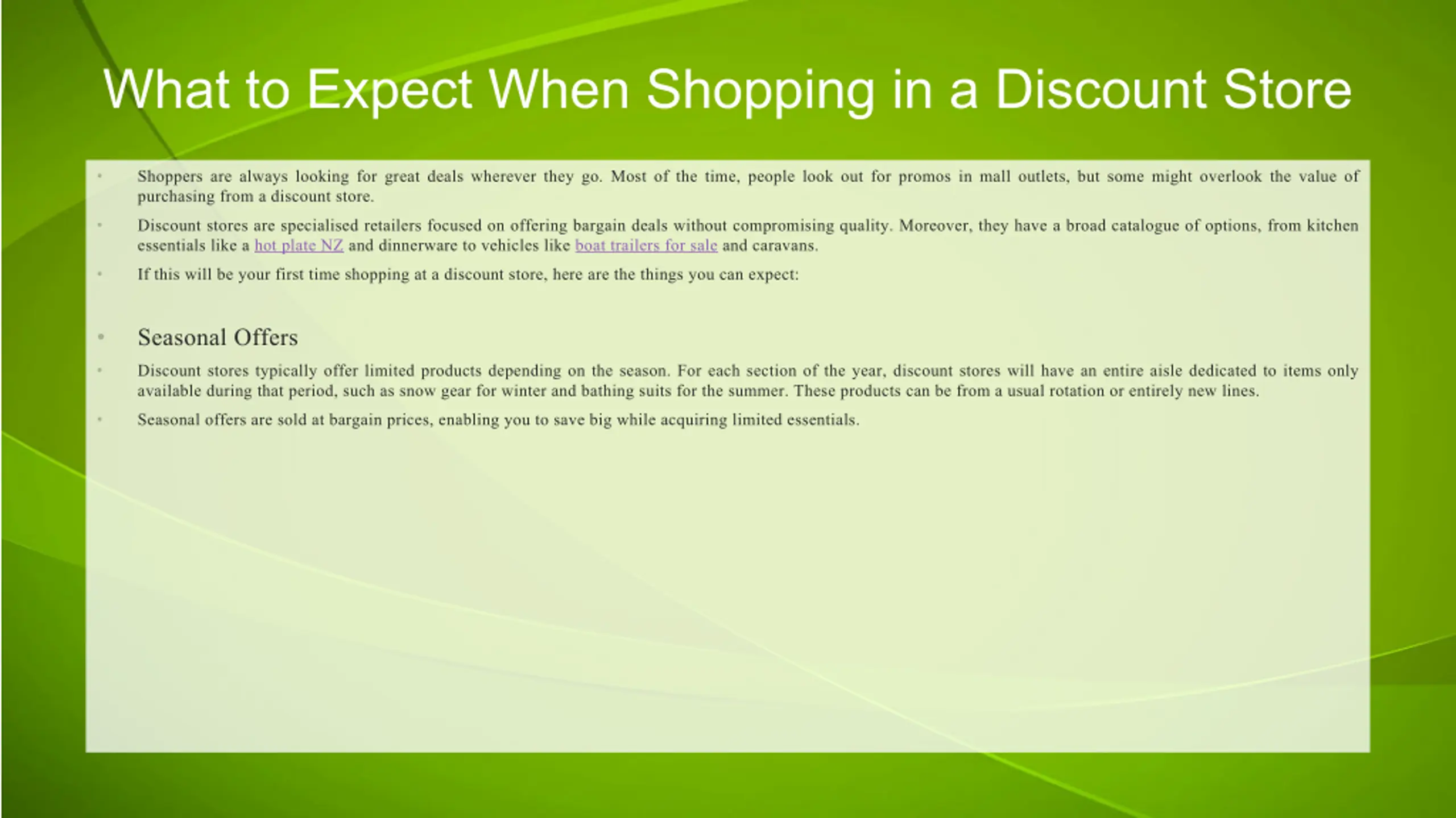 What to Expect When Shopping in a Discount Store Shoppers are always looking for great deals wherever they go. Most of the time, people look out for promos in mall outlets, but some might overlook the value of purchasing from a discount store. Discount stores are specialised retailers focused on offering bargain deals without compromising quality. Moreover, they have a broad catalogue of options, from kitchen essentials like a hot plate NZ and dinnerware to vehicles like boat trailers for sale and caravans. If this will be your first time shopping at a discount store, here are the things you can expect: Seasonal Offers Discount stores typically offer limited products depending on the season. For each section of the year, discount stores will have an entire aisle dedicated to items only available during that period, such as snow gear for winter and bathing suits for the summer. These products can be from a usual rotation or entirely new lines. Seasonal offers are sold at bargain prices, enabling you to save big while acquiring limited essentials.