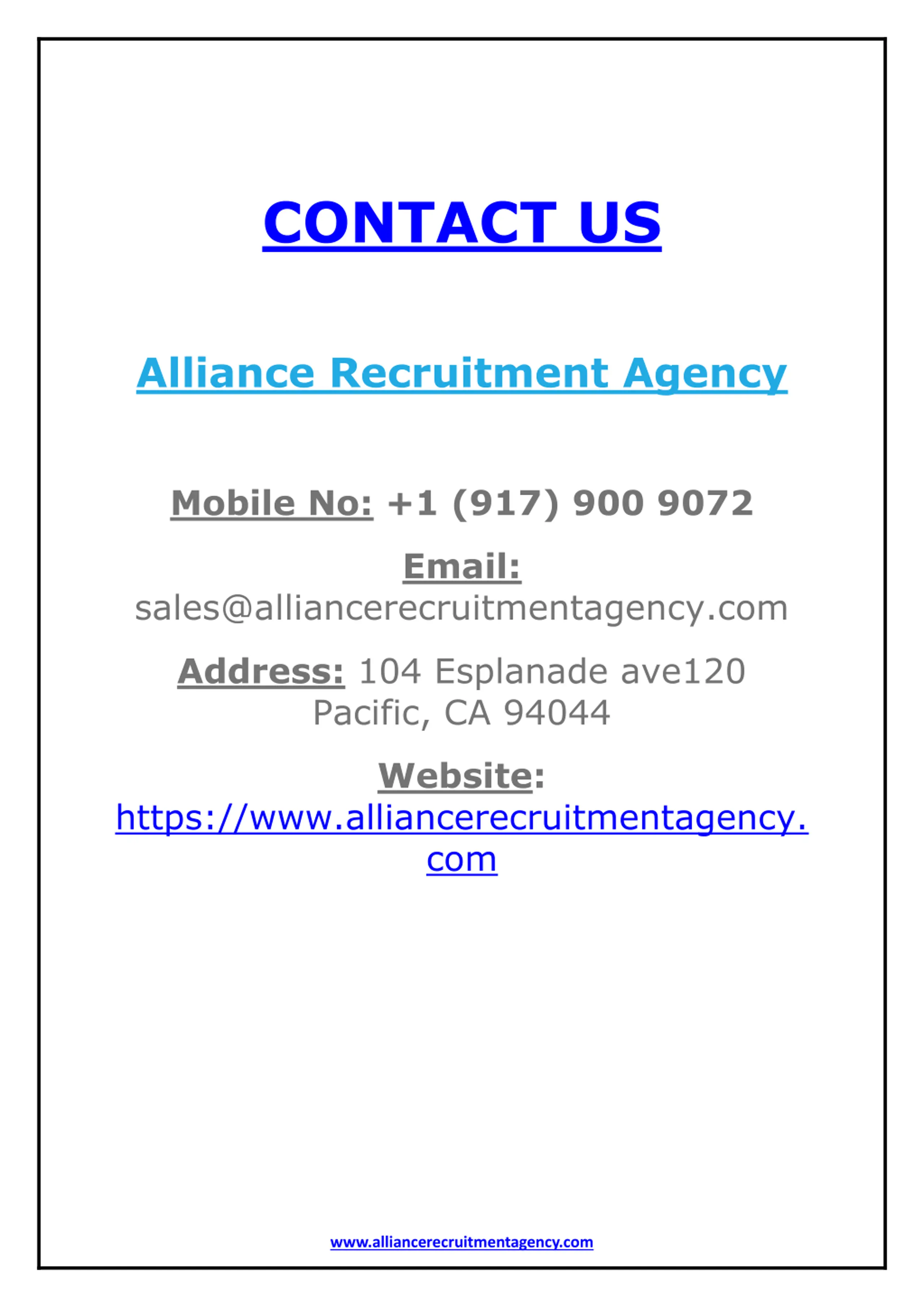 CONTACT US Alliance Recruitment Agency Mobile No: +1 (917) 900 9072 Email: sales@alliancerecruitmentagency.com Address: 104 Esplanade ave120 Pacific, CA 94044 Website: https://www.alliancerecruitmentagency. com www.alliancerecruitmentagency.com