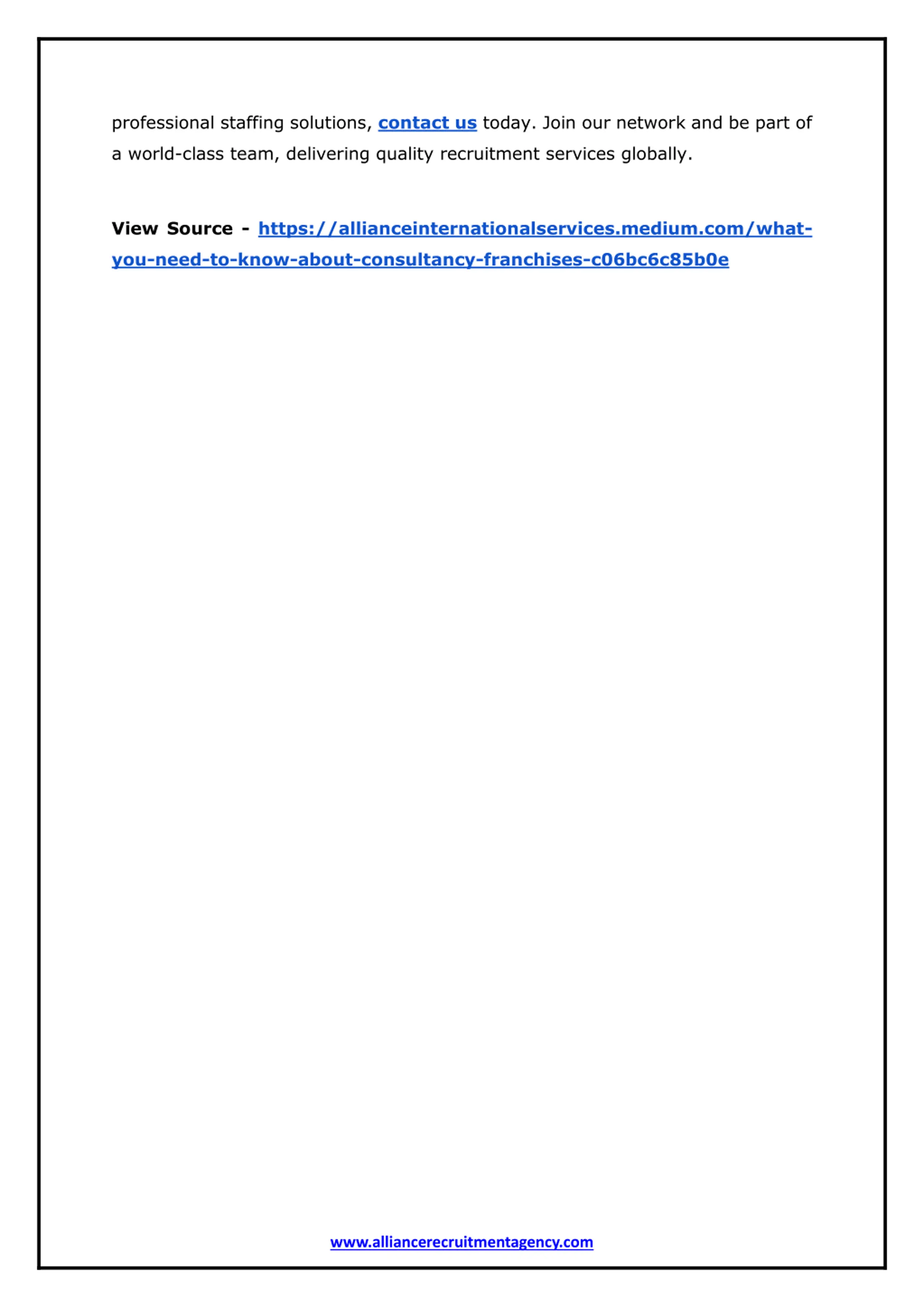 professional staffing solutions, contact us today. Join our network and be part of a world-class team, delivering quality recruitment services globally. View Source - https://allianceinternationalservices.medium.com/what- you-need-to-know-about-consultancy-franchises-c06bc6c85b0e www.alliancerecruitmentagency.com