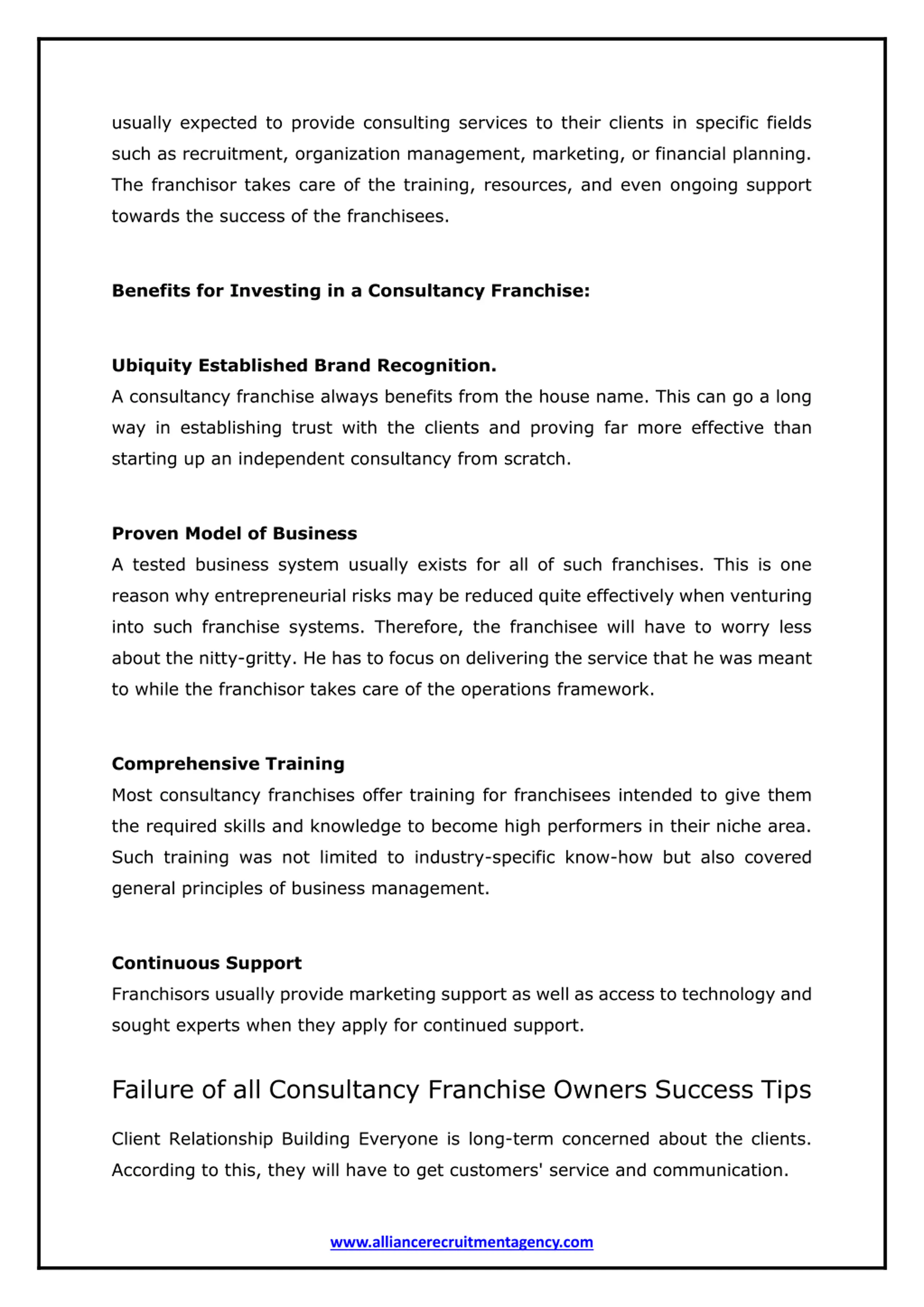 usually expected to provide consulting services to their clients in specific fields such as recruitment, organization management, marketing, or financial planning. The franchisor takes care of the training, resources, and even ongoing support towards the success of the franchisees. Benefits for Investing in a Consultancy Franchise: Ubiquity Established Brand Recognition. A consultancy franchise always benefits from the house name. This can go a long way in establishing trust with the clients and proving far more effective than starting up an independent consultancy from scratch. Proven Model of Business A tested business system usually exists for all of such franchises. This is one reason why entrepreneurial risks may be reduced quite effectively when venturing into such franchise systems. Therefore, the franchisee will have to worry less about the nitty-gritty. He has to focus on delivering the service that he was meant to while the franchisor takes care of the operations framework. Comprehensive Training Most consultancy franchises offer training for franchisees intended to give them the required skills and knowledge to become high performers in their niche area. Such training was not limited to industry-specific know-how but also covered general principles of business management. Continuous Support Franchisors usually provide marketing support as well as access to technology and sought experts when they apply for continued support. Failure of all Consultancy Franchise Owners Success Tips Client Relationship Building Everyone is long-term concerned about the clients. According to this, they will have to get customers' service and communication. www.alliancerecruitmentagency.com