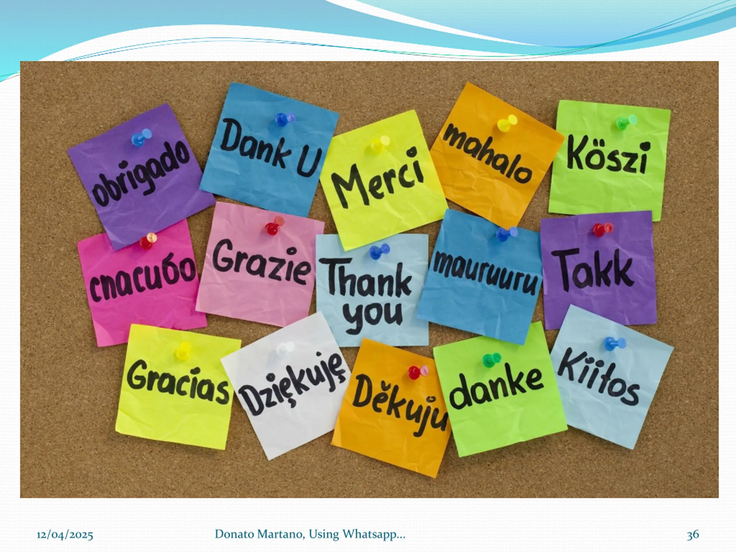 Final Remarks Implementing informal learning within formal learning contexts enhances students motivation and can improve performance SNS are particularly suitableVLEs to be used as a continuation of class activities Whatsappas a VLE offers a numberof advantages (ease of use, basic interaction, integrating skills, extra tools) Some precautions must be taken by the teacher, particularlyconcerning privacy issues Informal VLEs such as SNS can be implemented effectively in Higher Education contexts 12/04/2025 Donato Martano, Using Whatsapp... 35