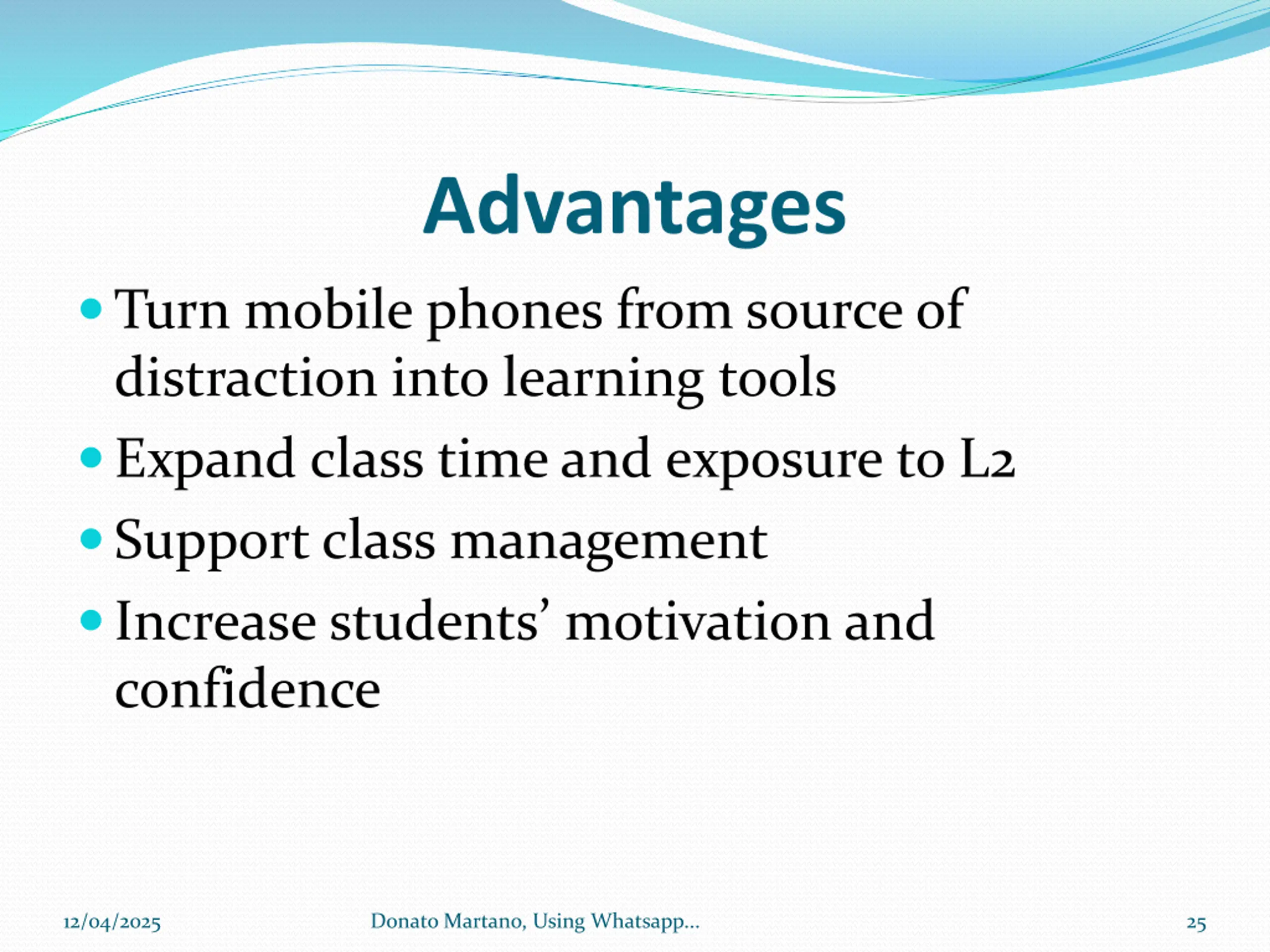 Advantages Turn mobile phones from source of distraction into learning tools Expand class time and exposure to L2 Supportclass management Increase students motivation and confidence 12/04/2025 Donato Martano, Using Whatsapp... 25