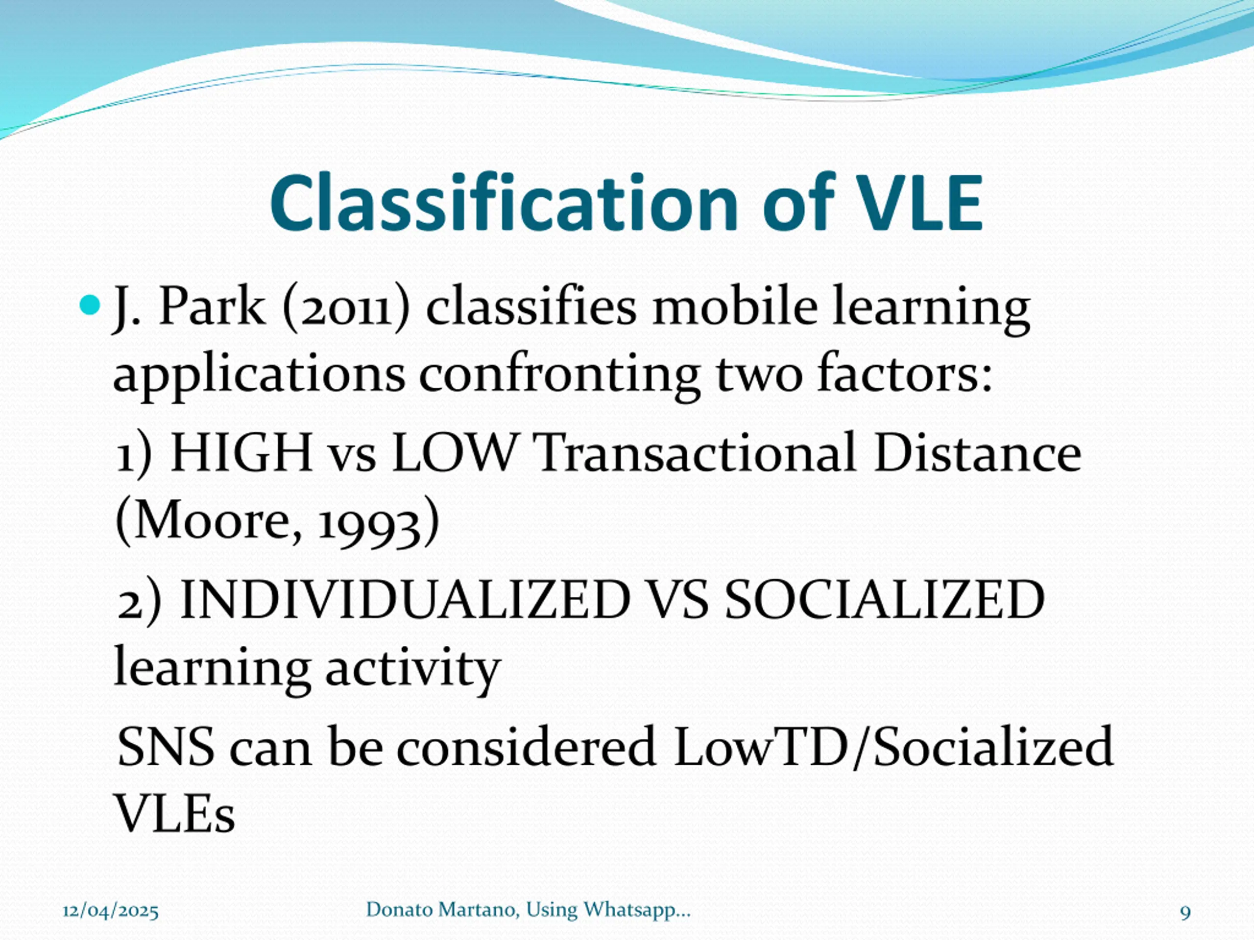 Classification of VLE J. Park (2011) classifies mobile learning applications confronting two factors: 1) HIGH vs LOW Transactional Distance (Moore, 1993) 2) INDIVIDUALIZED VS SOCIALIZED learning activity SNS can be considered LowTD/Socialized VLEs 12/04/2025 Donato Martano, Using Whatsapp... 9