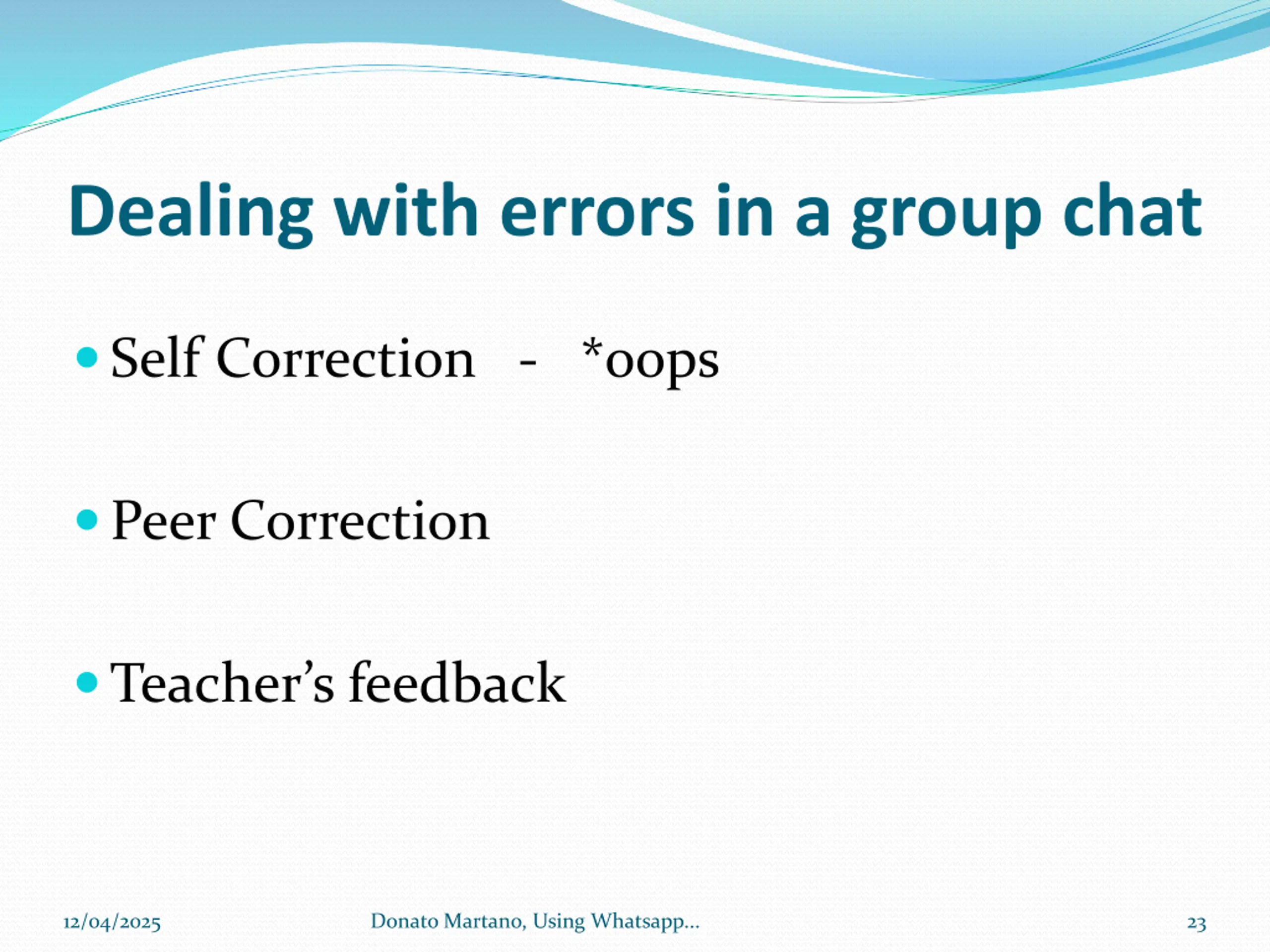 Dealing with errors in a group chat Self Correction - *oops Peer Correction Teacher s feedback 12/04/2025 Donato Martano, Using Whatsapp... 23