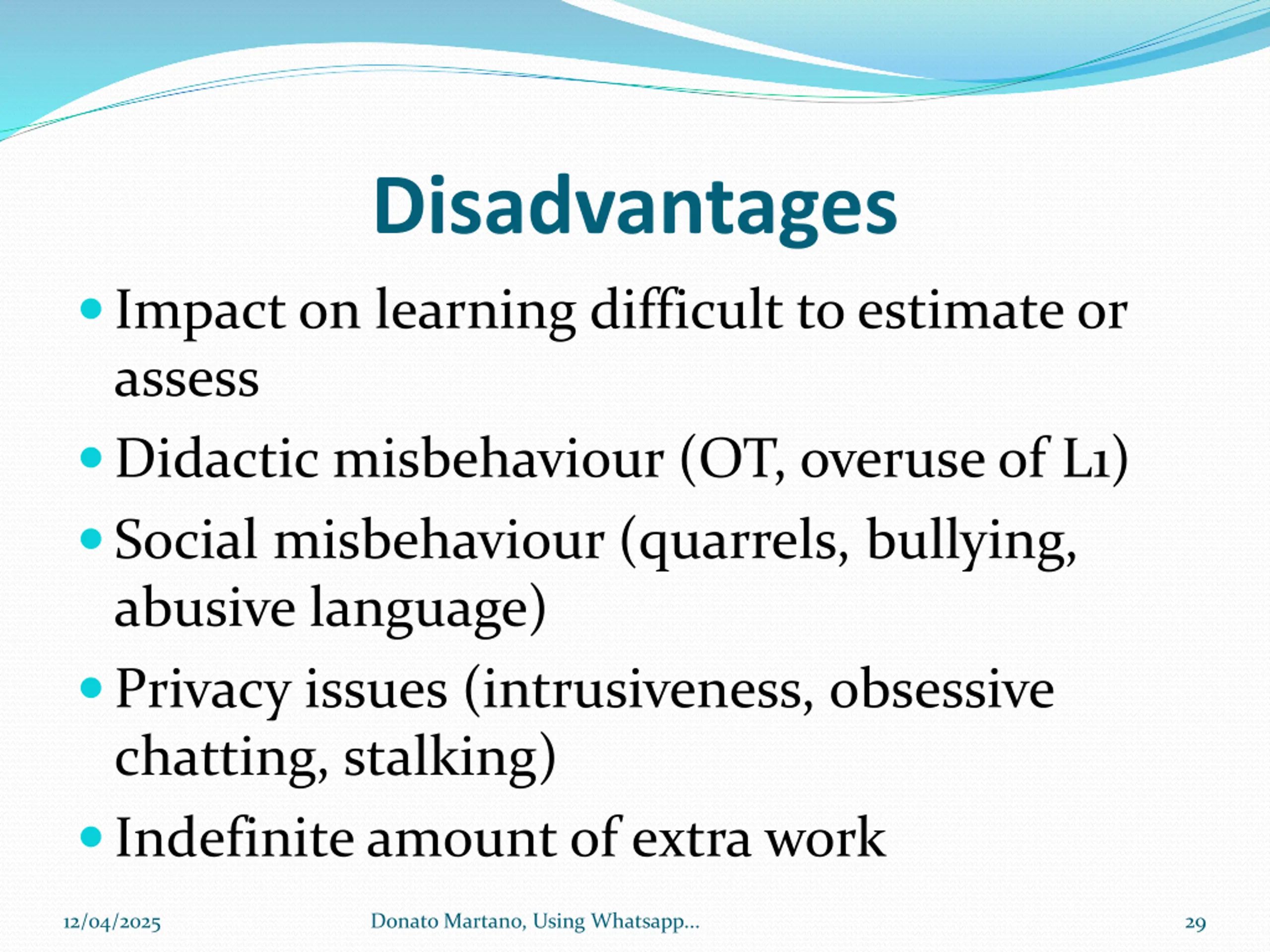 Disadvantages Impact on learning difficult toestimate or assess Didactic misbehaviour (OT, overuse of L1) Social misbehaviour (quarrels, bullying, abusive language) Privacy issues (intrusiveness, obsessive chatting, stalking) Indefinite amount of extra work 12/04/2025 Donato Martano, Using Whatsapp... 29