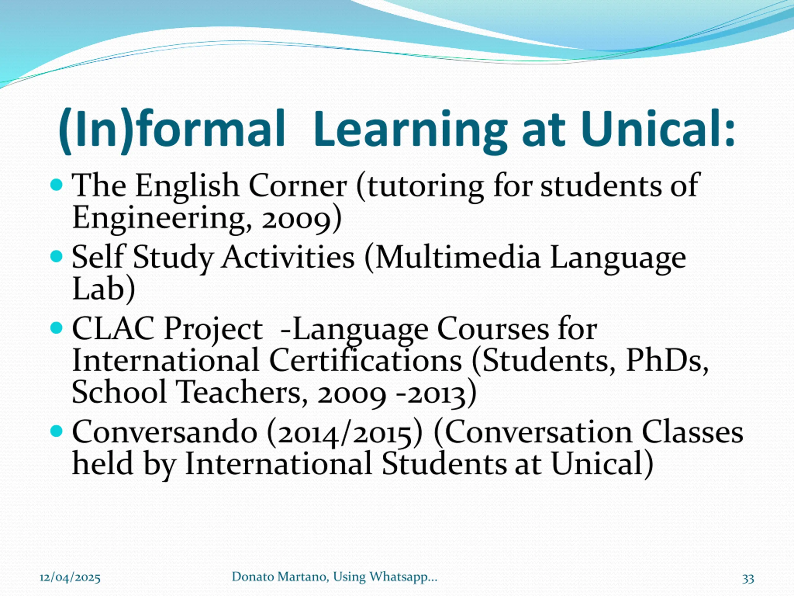 (In)formal Learning at Unical: The English Corner (tutoring forstudents of Engineering, 2009) Self Study Activities (Multimedia Language Lab) CLAC Project -Language Courses for International Certifications (Students, PhDs, School Teachers, 2009 -2013) Conversando (2014/2015) (Conversation Classes held by International Students at Unical) 12/04/2025 Donato Martano, Using Whatsapp... 33
