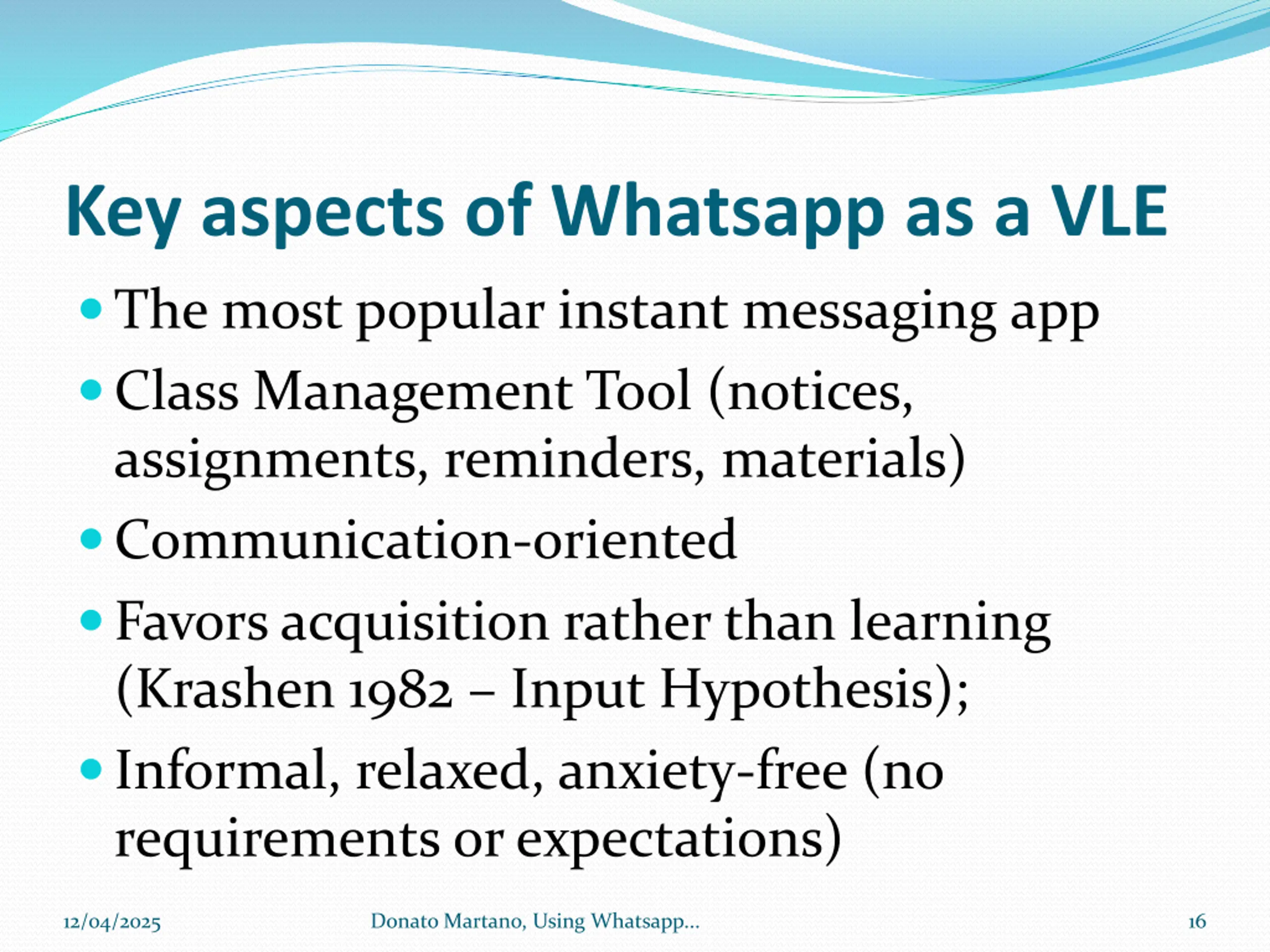 Key aspects of Whatsapp as a VLE The most popular instant messaging app Class Management Tool (notices, assignments, reminders, materials) Communication-oriented Favorsacquisition rather than learning (Krashen 1982 Input Hypothesis); Informal, relaxed, anxiety-free (no requirements or expectations) 12/04/2025 Donato Martano, Using Whatsapp... 16