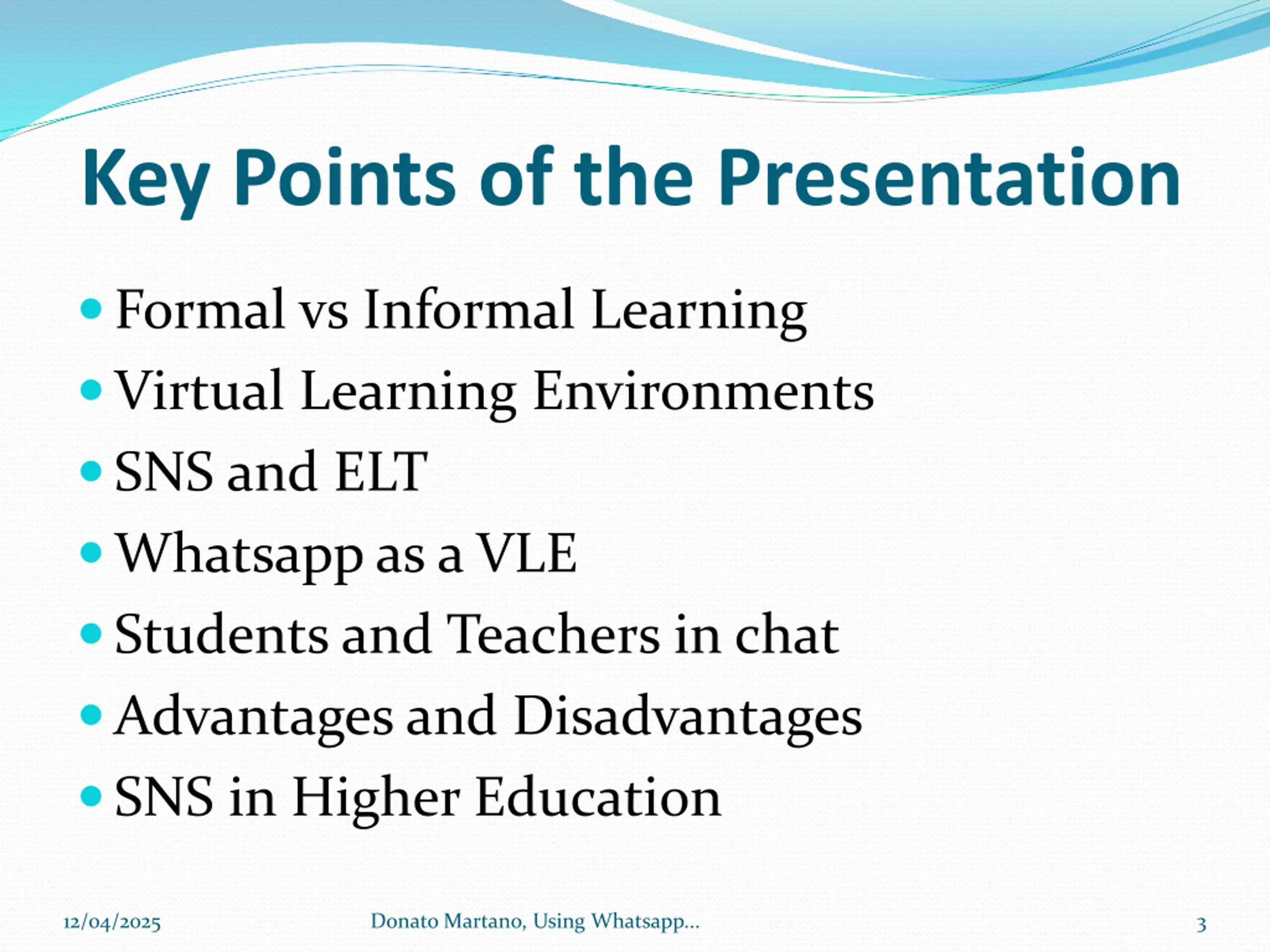 Key Points of the Presentation Formal vs Informal Learning Virtual Learning Environments SNS and ELT Whatsappas a VLE Students and Teachers in chat Advantages and Disadvantages SNS in Higher Education 12/04/2025 Donato Martano, Using Whatsapp... 3