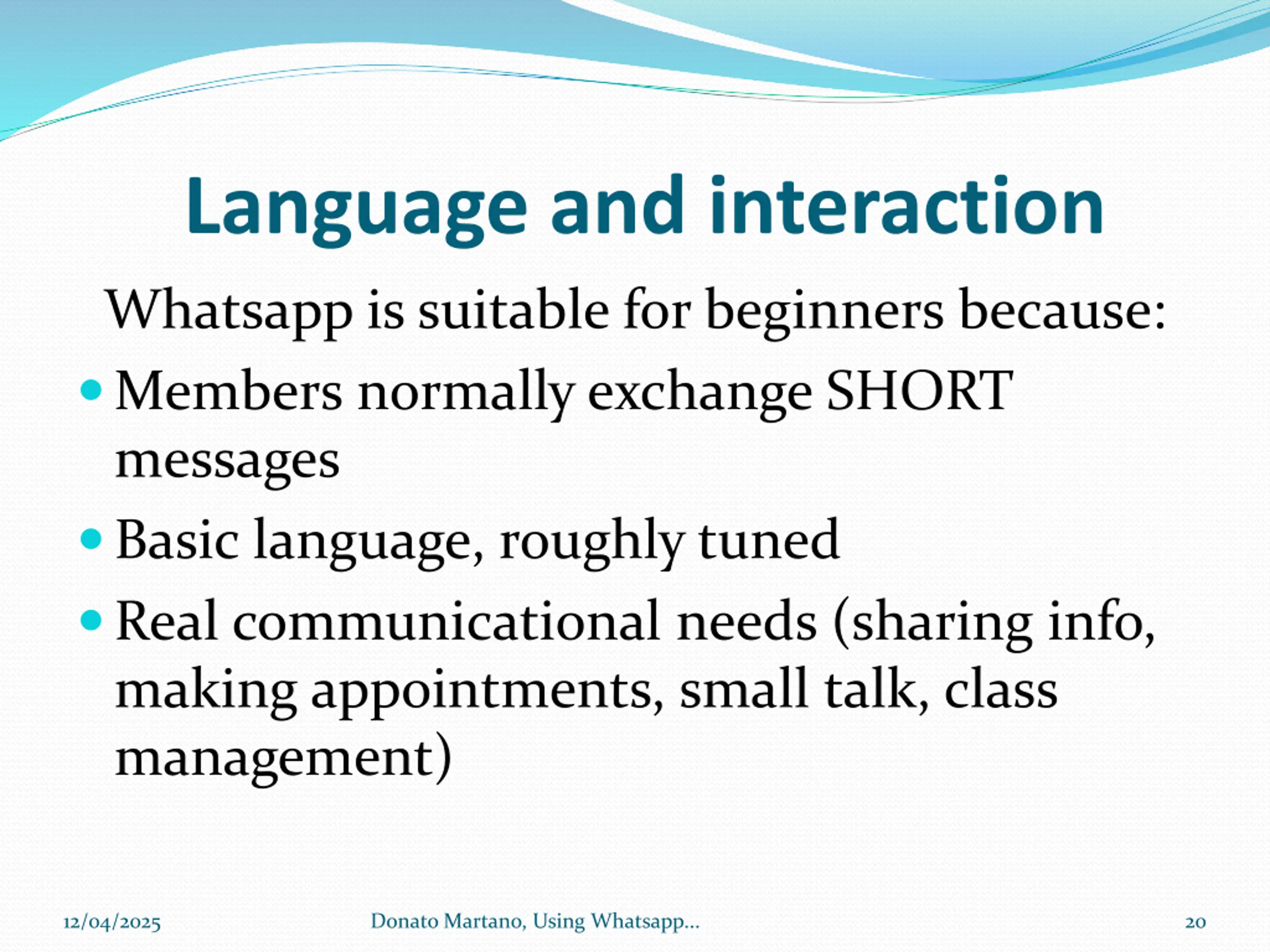 Language and interaction Whatsapp is suitable for beginners because: Members normally exchange SHORT messages Basic language, roughly tuned Real communicational needs (sharing info, making appointments, small talk, class management) 12/04/2025 Donato Martano, Using Whatsapp... 20