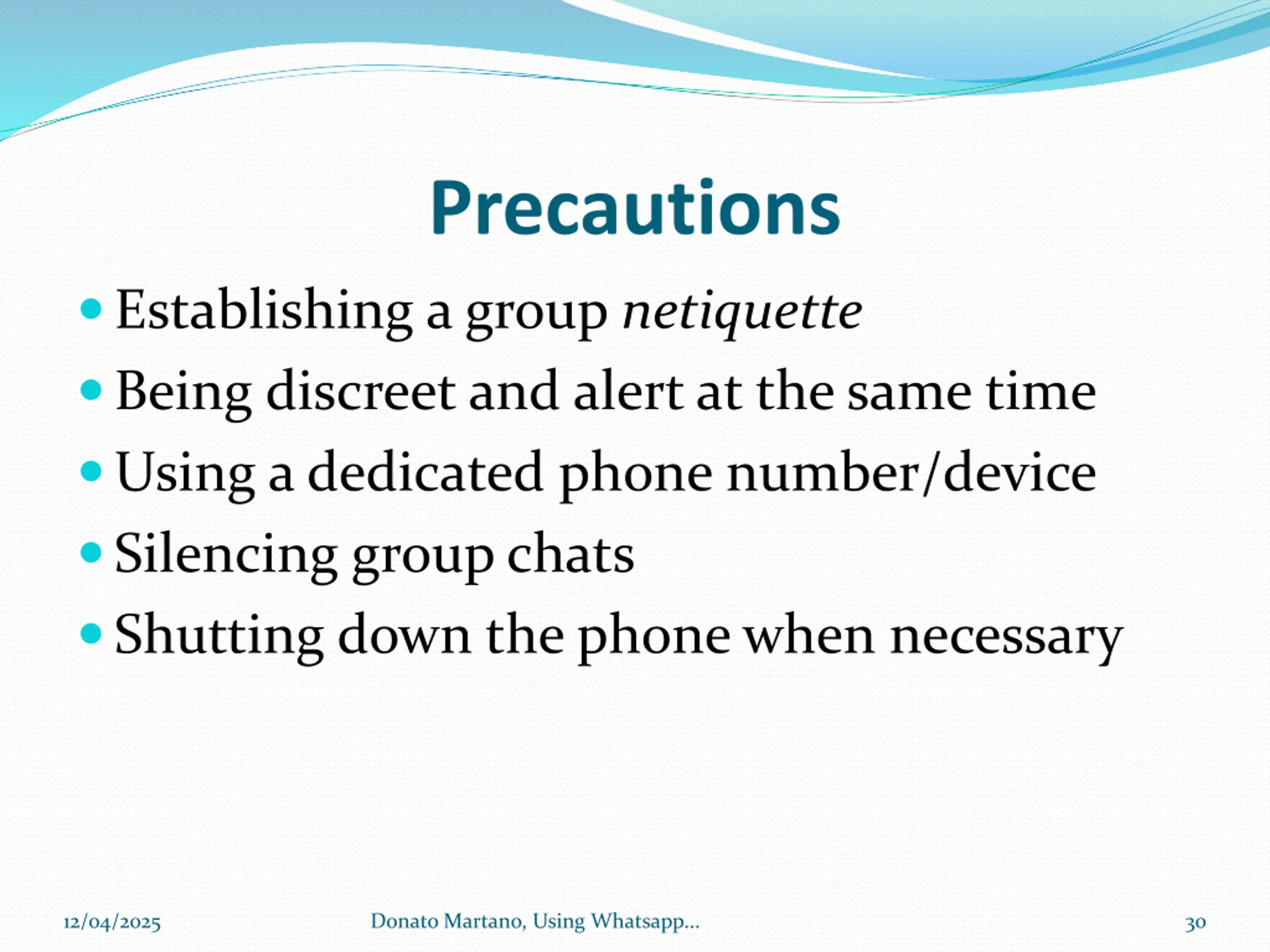 Precautions Establishing a group netiquette Being discreet and alert at the same time Using a dedicated phone number/device Silencing groupchats Shutting down the phonewhen necessary 12/04/2025 Donato Martano, Using Whatsapp... 30