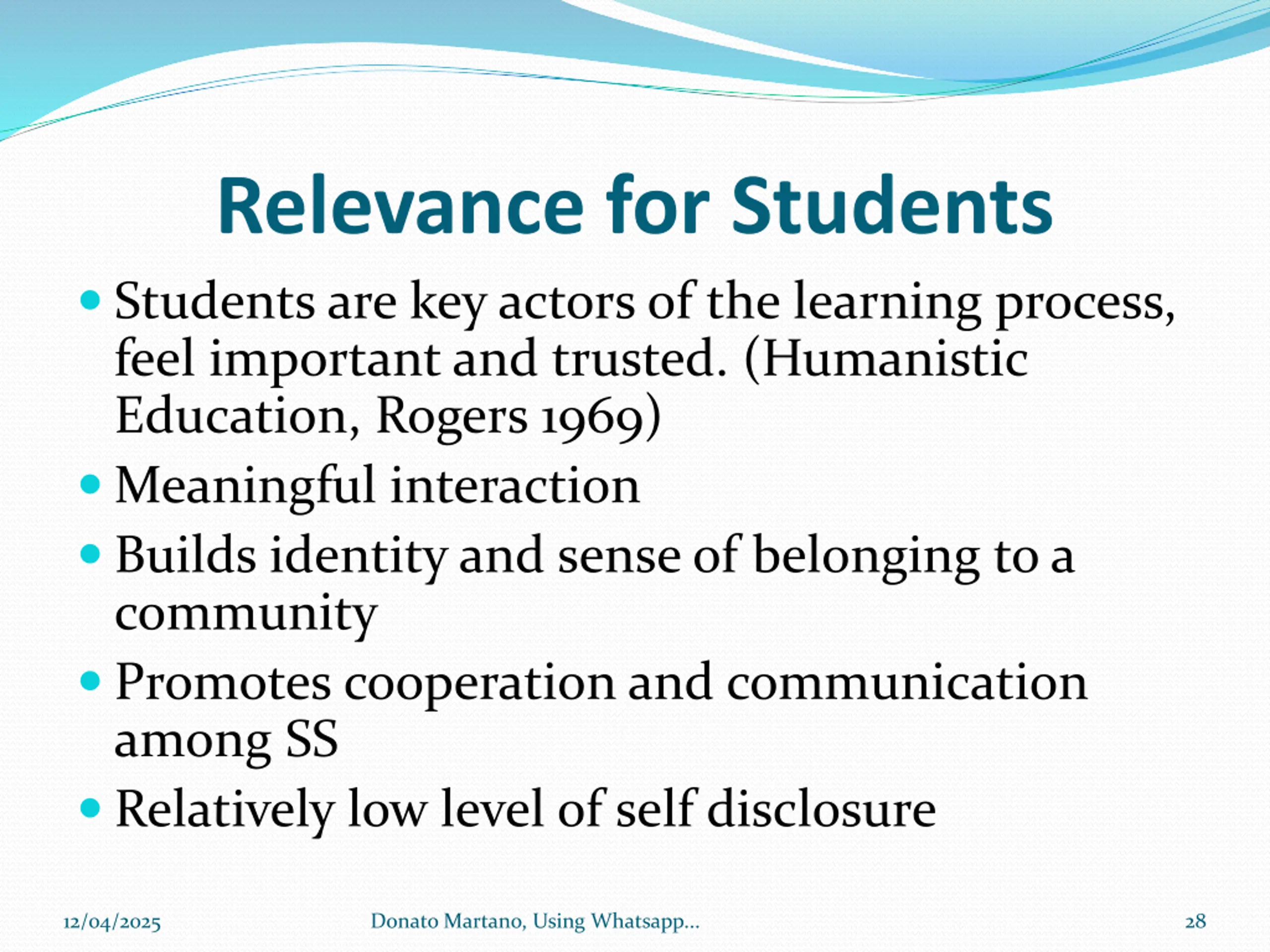 Relevance for Students Students are key actors of the learning process, feel important and trusted. (Humanistic Education, Rogers 1969) Meaningful interaction Builds identity and sense of belonging to a community Promotes cooperation and communication among SS Relatively low level of self disclosure 12/04/2025 Donato Martano, Using Whatsapp... 28