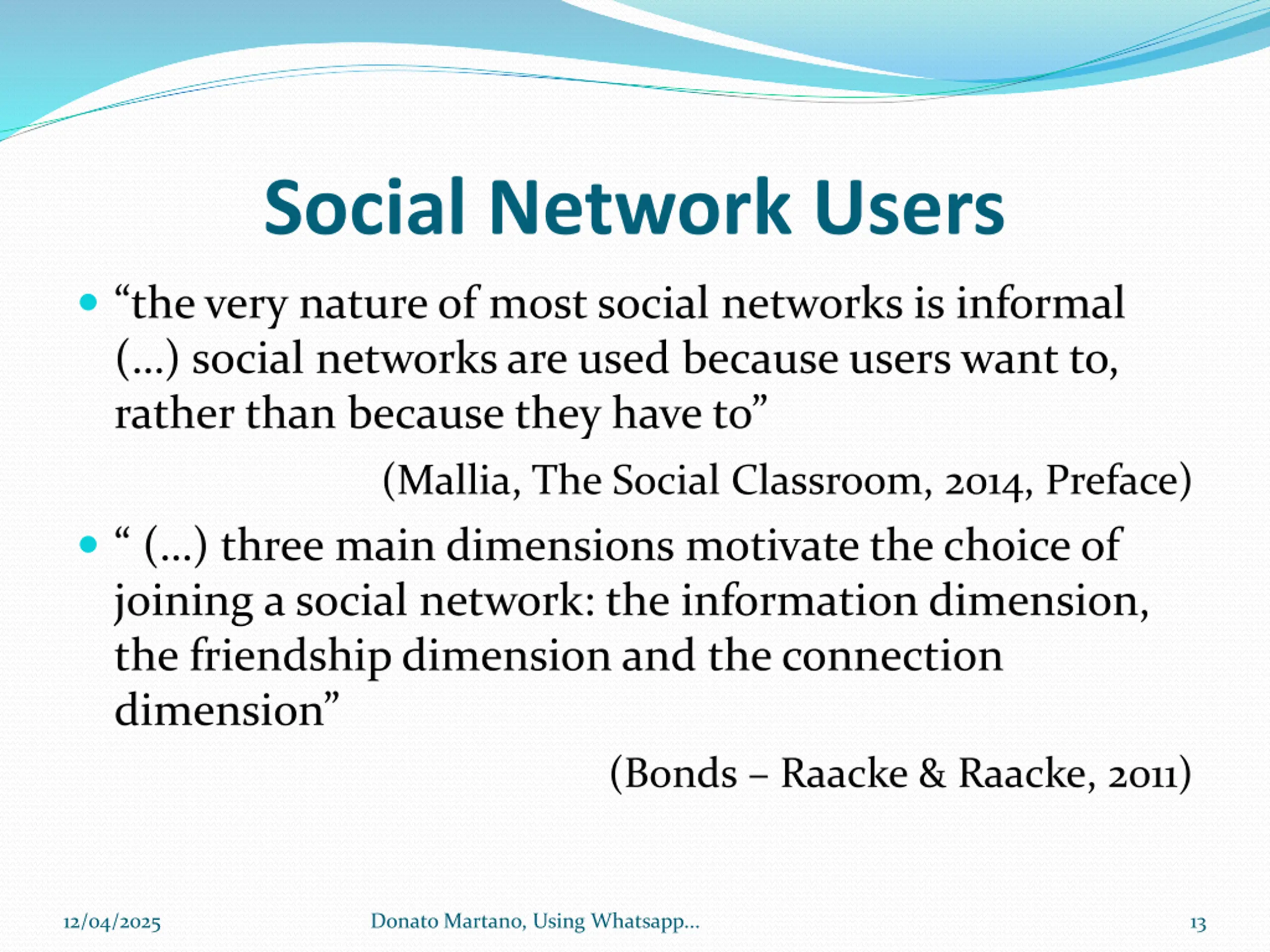 Social Network Users the very nature of most social networks is informal ( ) social networks are used because users want to, rather than because they have to (Mallia, The Social Classroom, 2014, Preface) ( ) three main dimensions motivate the choice of joining a social network: the information dimension, the friendship dimension and the connection dimension (Bonds Raacke & Raacke, 2011) 12/04/2025 Donato Martano, Using Whatsapp... 13