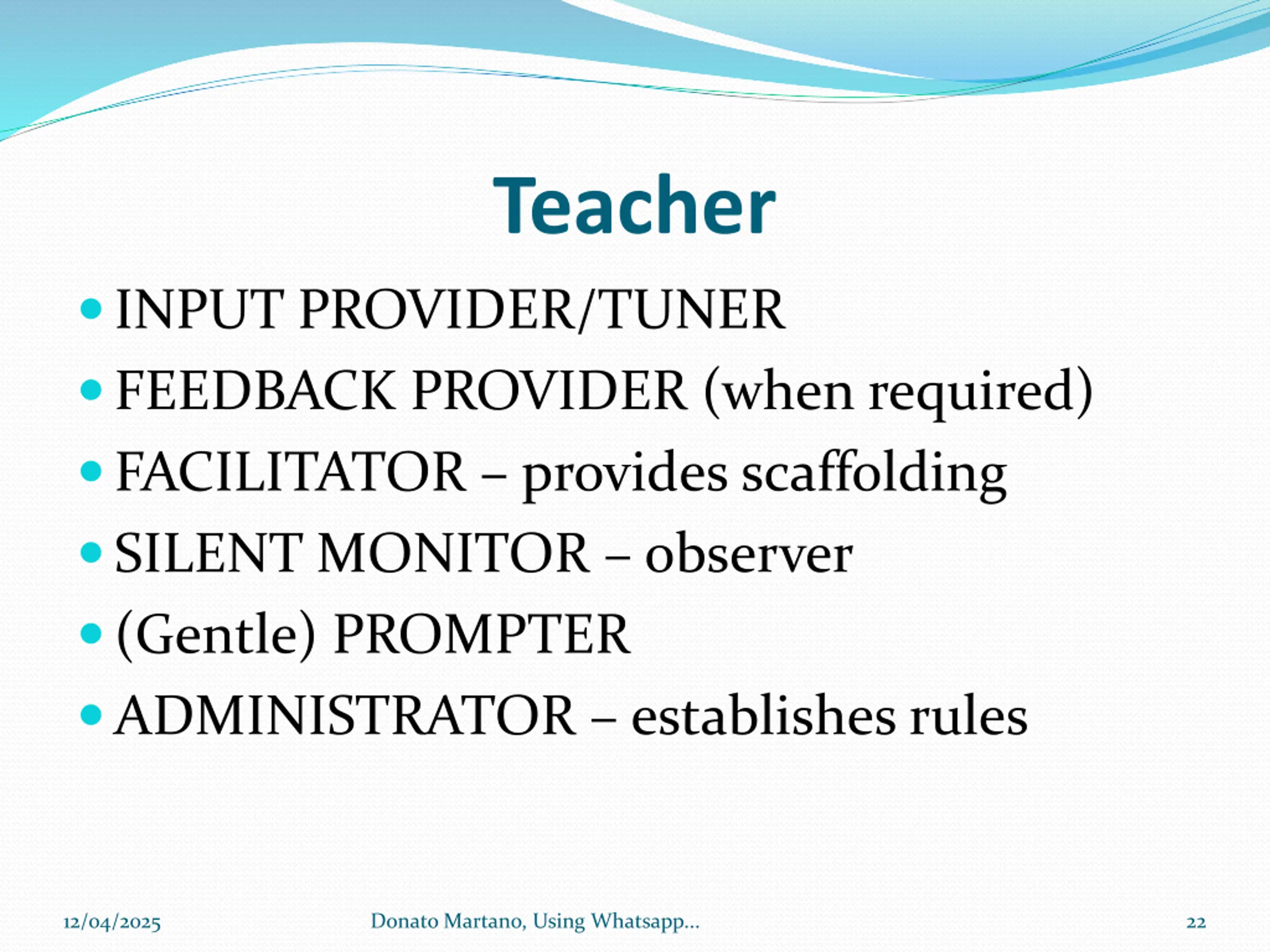 Teacher INPUT PROVIDER/TUNER FEEDBACK PROVIDER (when required) FACILITATOR provides scaffolding SILENT MONITOR observer (Gentle) PROMPTER ADMINISTRATOR establishes rules 12/04/2025 Donato Martano, Using Whatsapp... 22