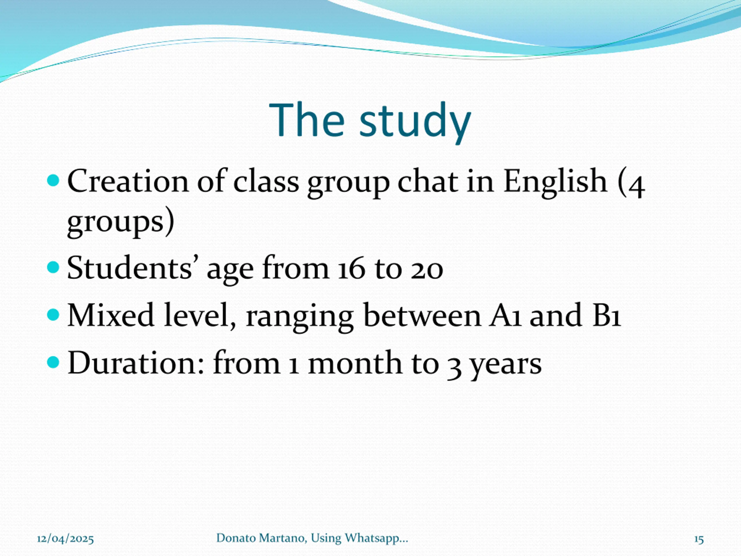 The study Creation of class groupchat in English (4 groups) Students age from 16 to 20 Mixed level, ranging between A1 and B1 Duration: from 1 month to 3 years 12/04/2025 Donato Martano, Using Whatsapp... 15