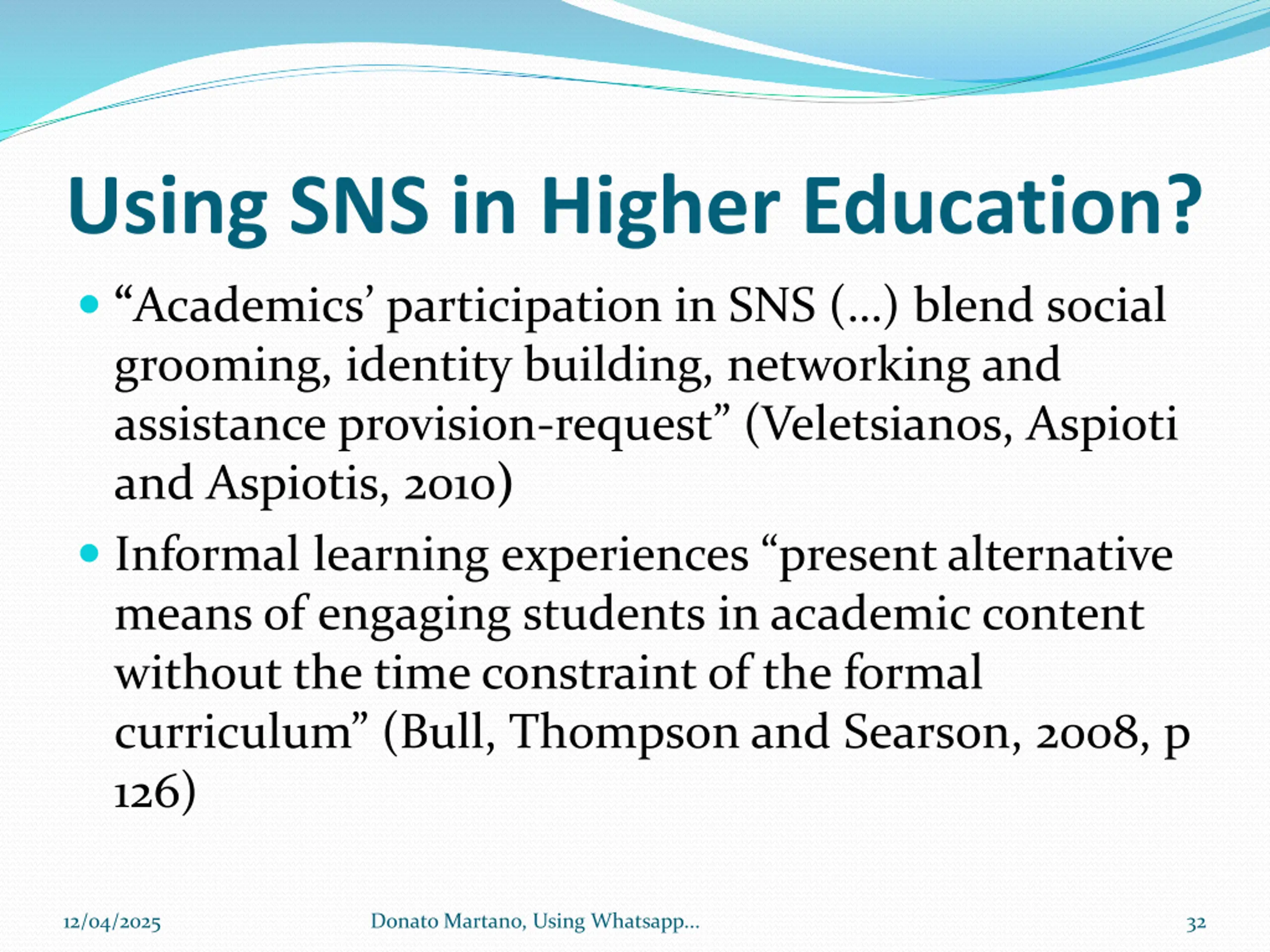 Using SNS in Higher Education? Academics participation in SNS ( ) blend social grooming, identity building, networking and assistance provision-request (Veletsianos, Aspioti and Aspiotis, 2010) Informal learning experiences present alternative means of engaging students in academic content without the time constraint of the formal curriculum (Bull, Thompson and Searson, 2008, p 126) 12/04/2025 Donato Martano, Using Whatsapp... 32