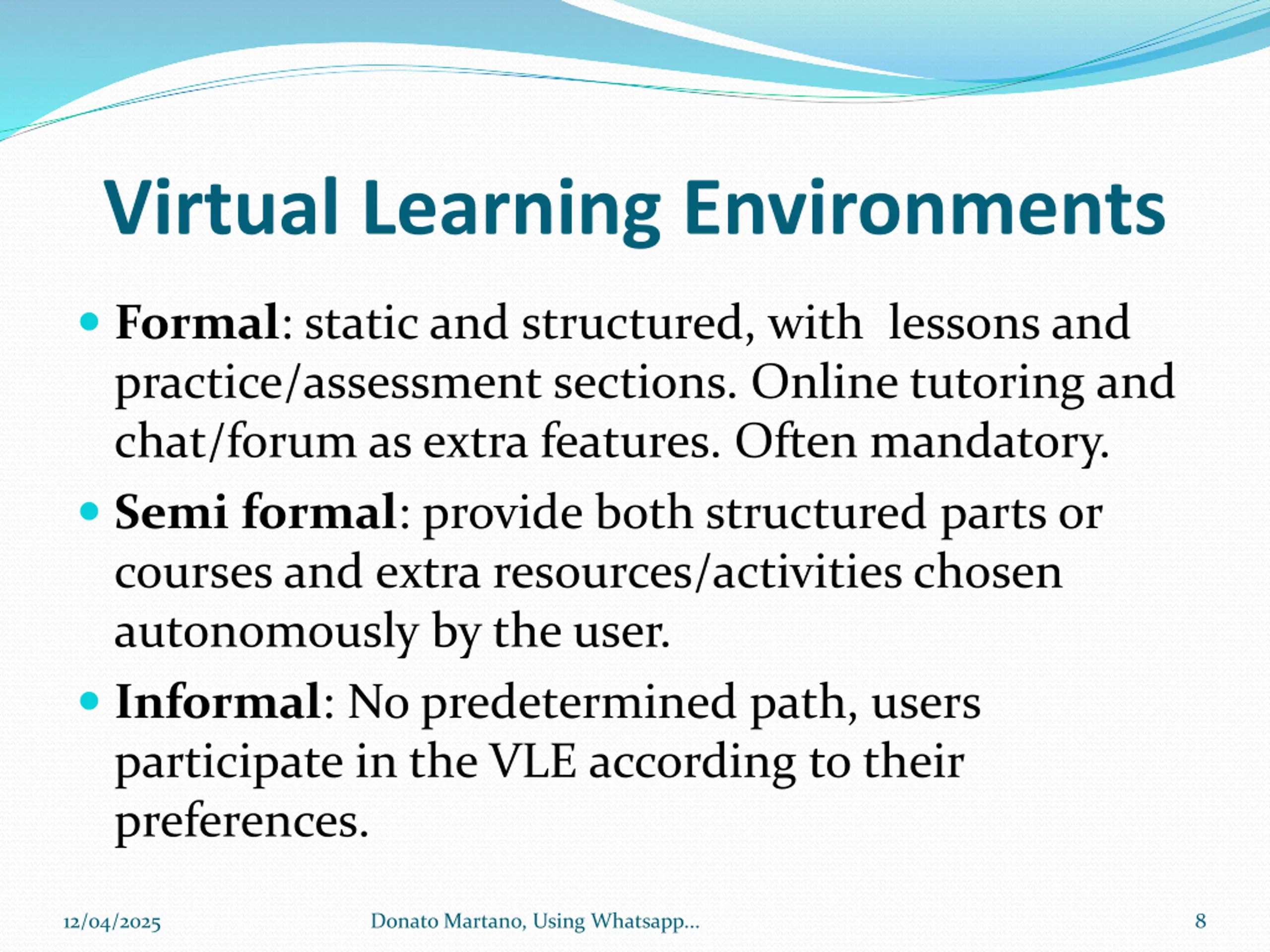 Virtual Learning Environments Formal: static and structured, with lessons and practice/assessment sections. Online tutoring and chat/forum as extra features. Often mandatory. Semi formal: provide both structured parts or courses and extra resources/activities chosen autonomously by the user. Informal: No predetermined path, users participate in the VLE according to their preferences. 12/04/2025 Donato Martano, Using Whatsapp... 8